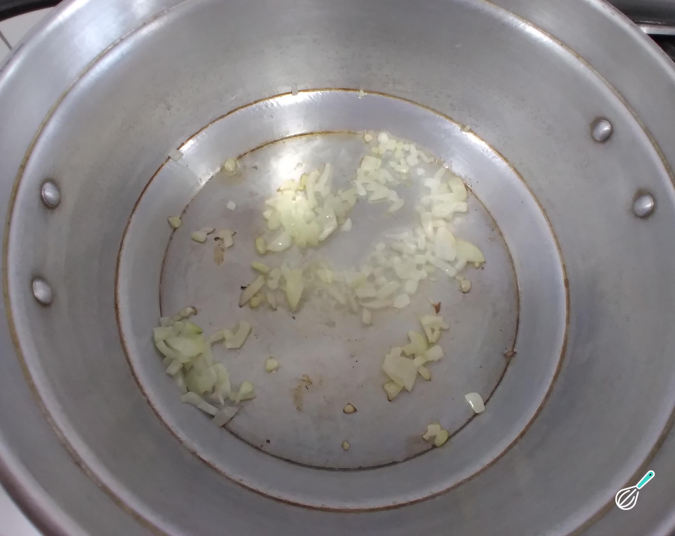 Em uma panela, coloque o óleo e refogue a cebola branca. Mexa para que solte líquido. Assim o feijão ficará mais saboroso.