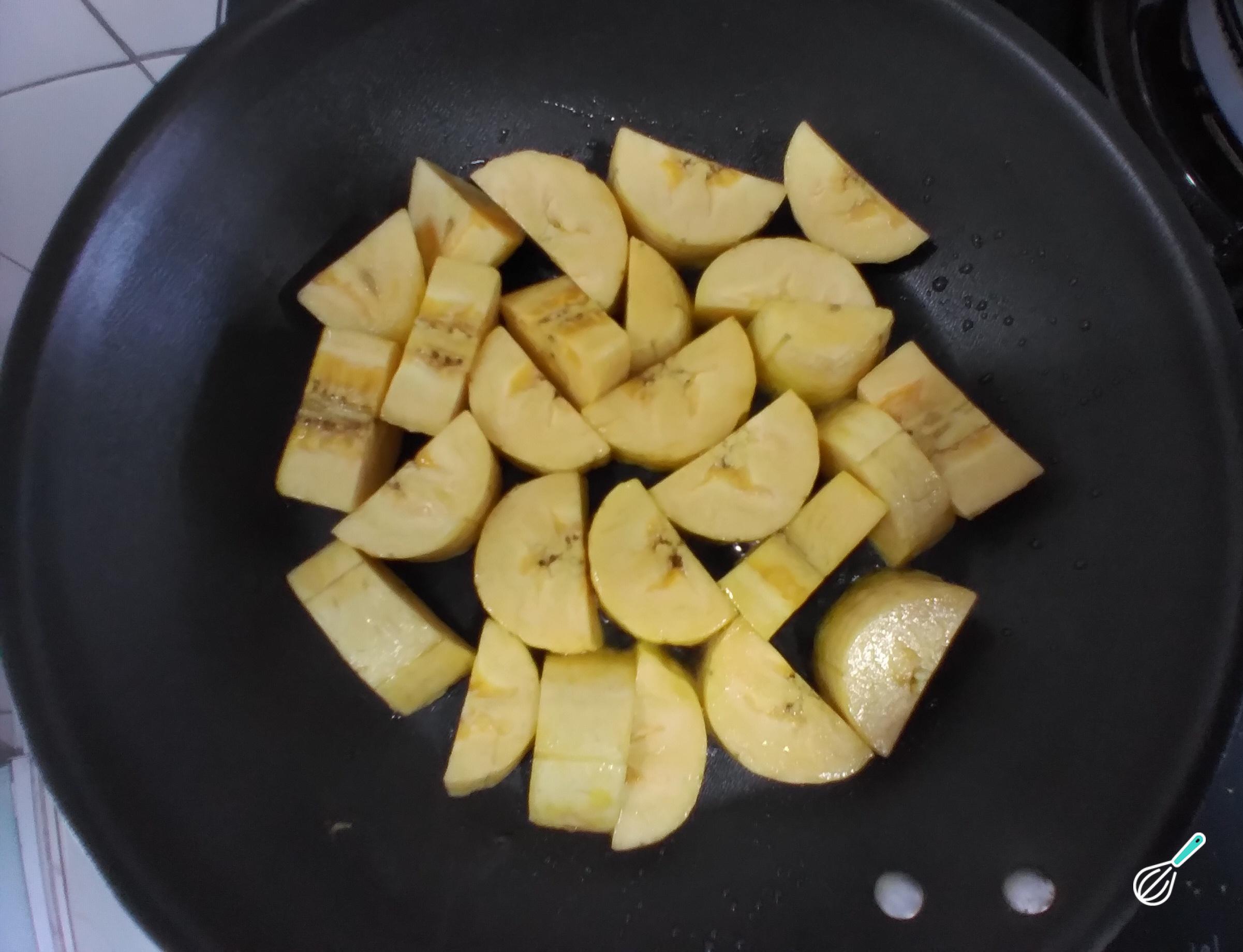 Enquanto o feijão refoga, em uma frigideira, coloque um pouco de azeite e toste as bananas.1 colher de chá é o suficiente. Deixe que dourem de um lado, depois vire e deixe que dorem do outro lado.