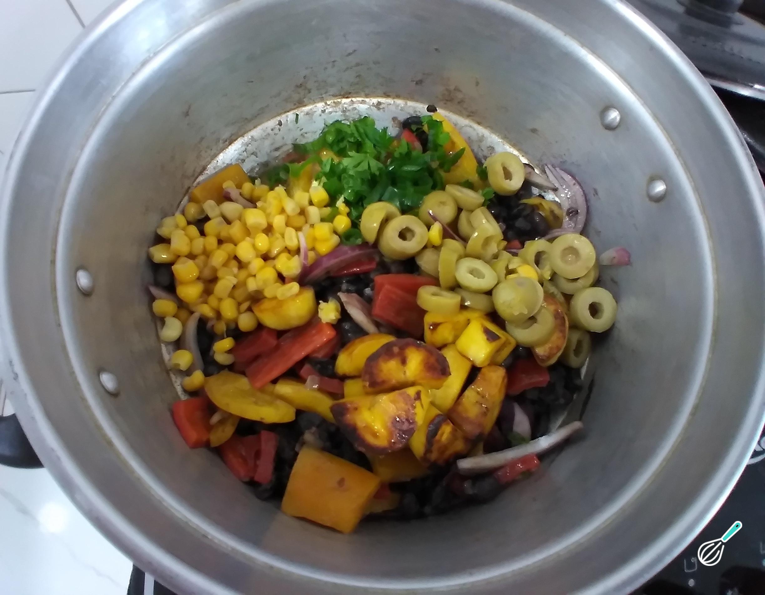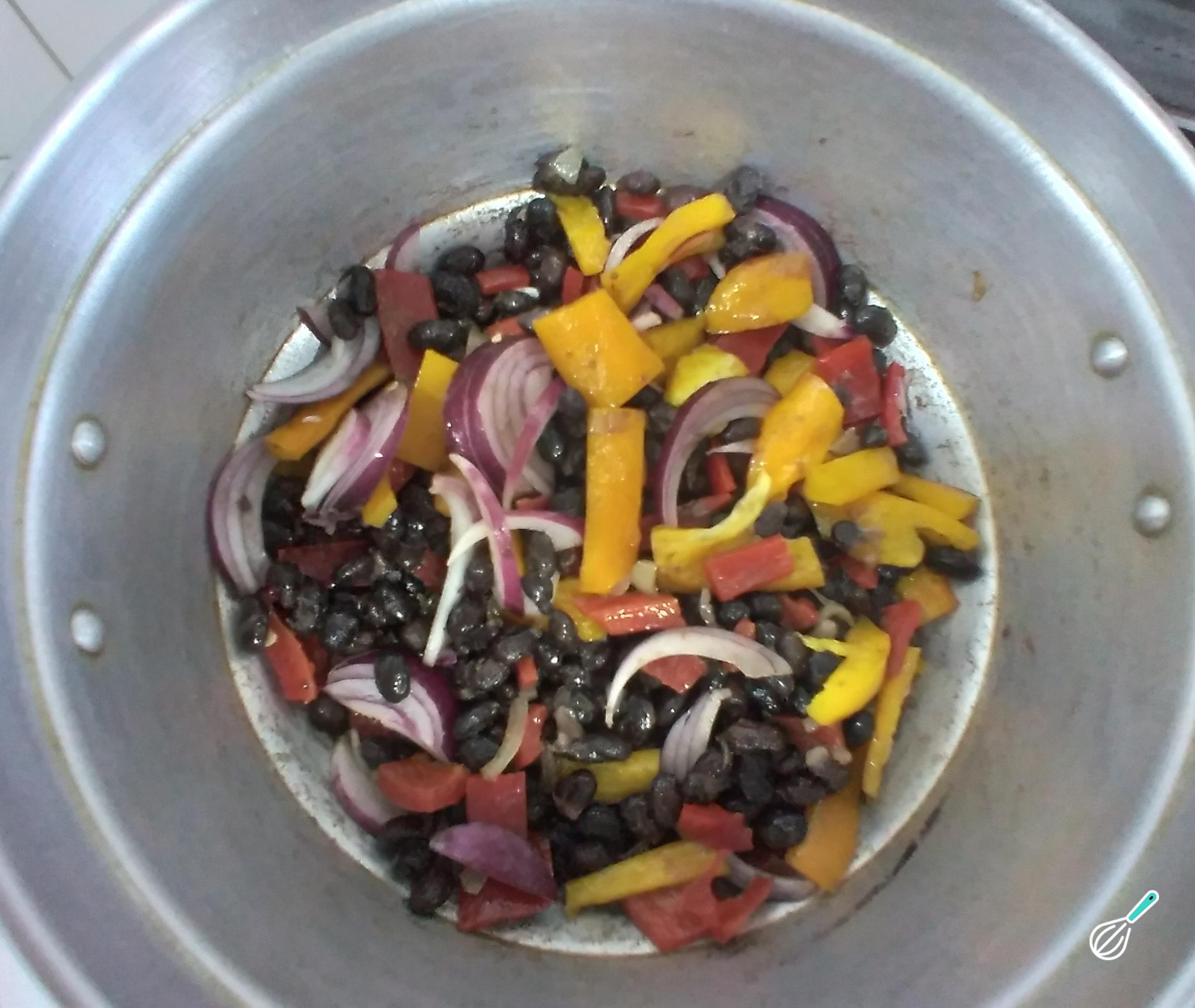 Depois de refogar o feijão, acrescente os pimentões e a cebola roxa. Mexa delicadamente e deixe absorver os sabores.
