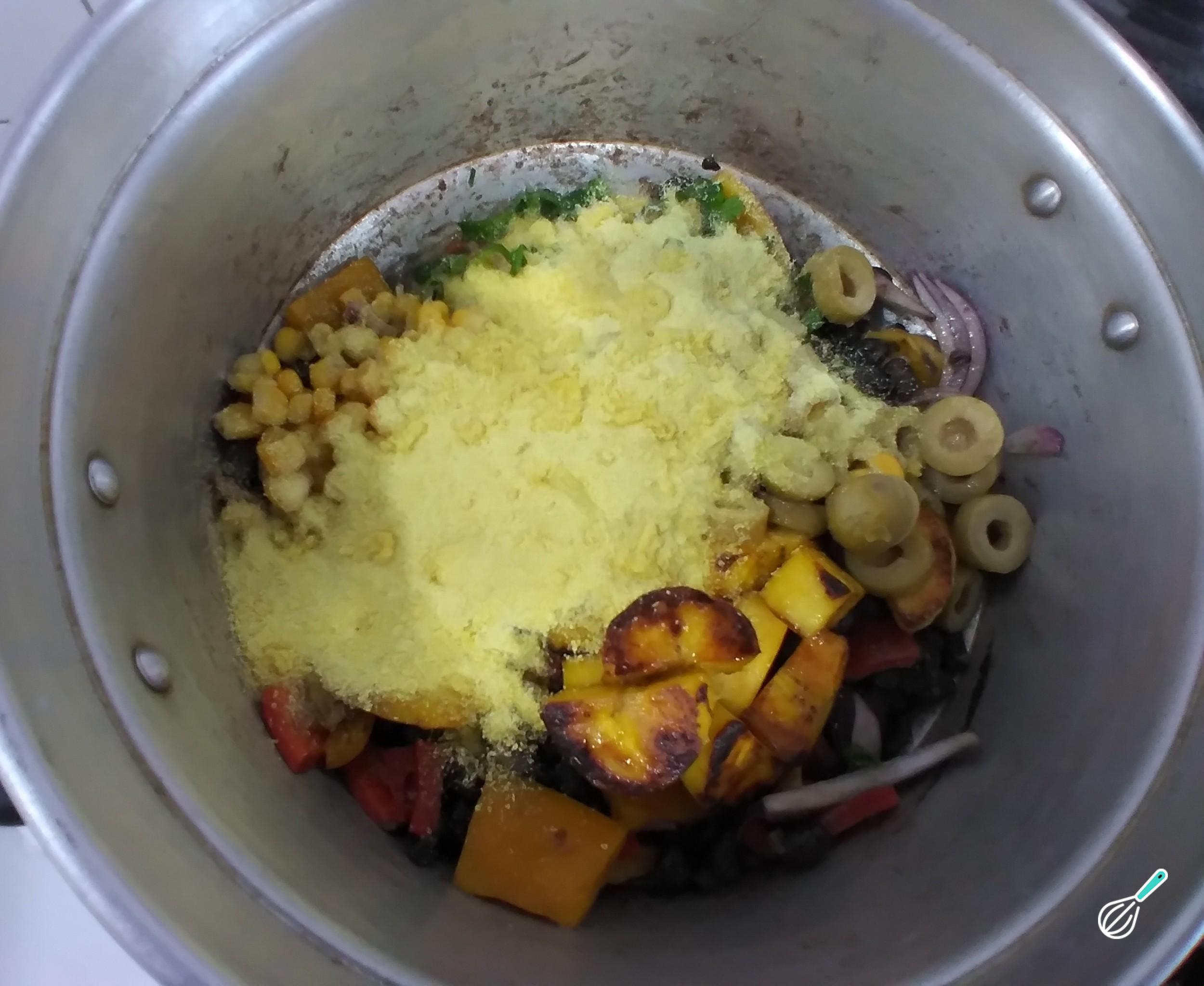 Acrescente o restante dos ingredientes, incluindo a metade da banana da terra frita. Reserve somente a farinha de mandioca. Mexa delicadamente. Acrescente a margarina ou azeite, mexendo sempre.