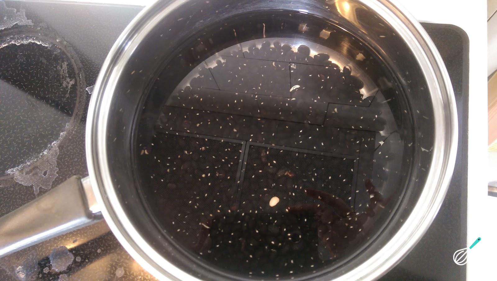 Coloque o azeite de oliva, o alho, as pimentas, o louro, o tomilho e, se desejar, sal em outra panela. Adicione os feijões amassados do passo anterior e leve ao fogo, misturando bem.