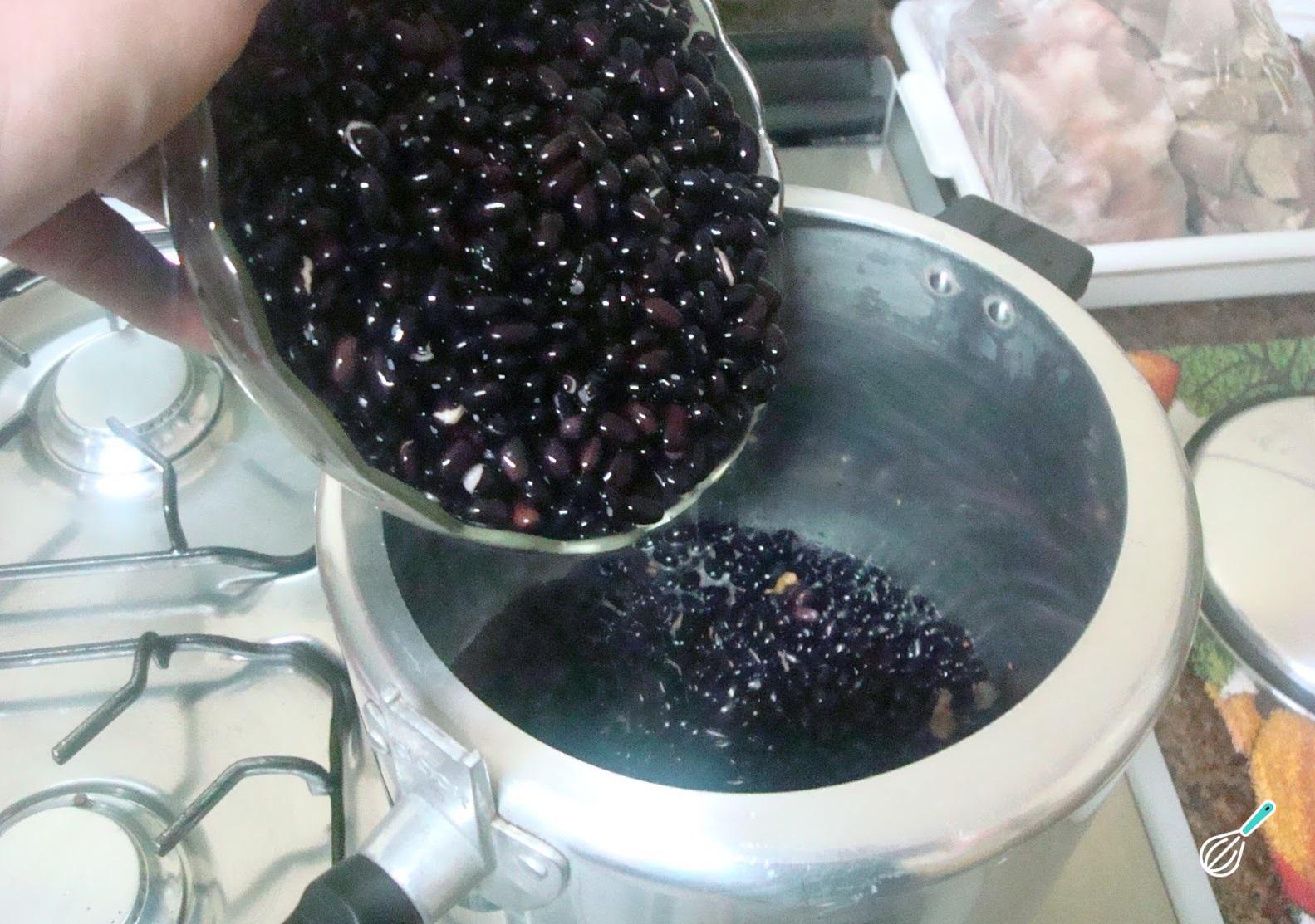 Reúna os ingredientes e coloque o feijão e as carnes em uma panela de pressão. Cubra com a água e deixe cozinhar em fogo médio, contando 20 minutos após a fervura. Depois desse período, apague o fogo e separe uma xícara de feijão. Amasse com ajuda de um garfo e reserve.