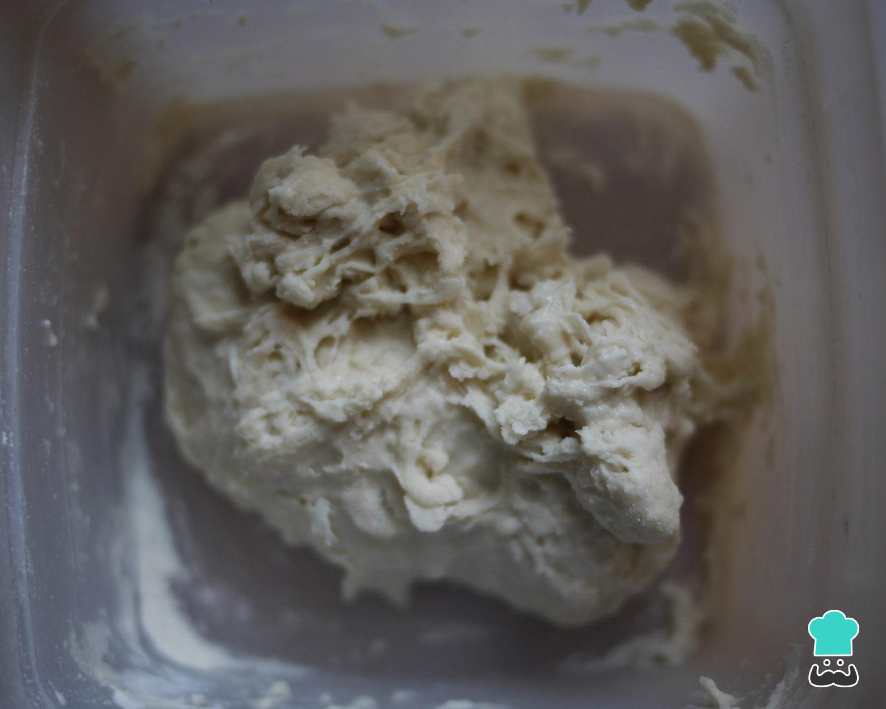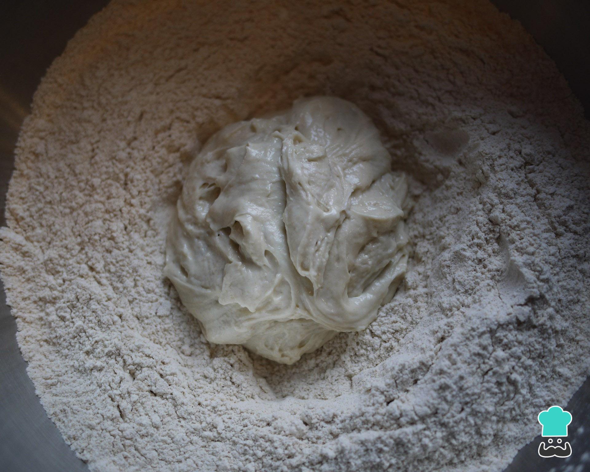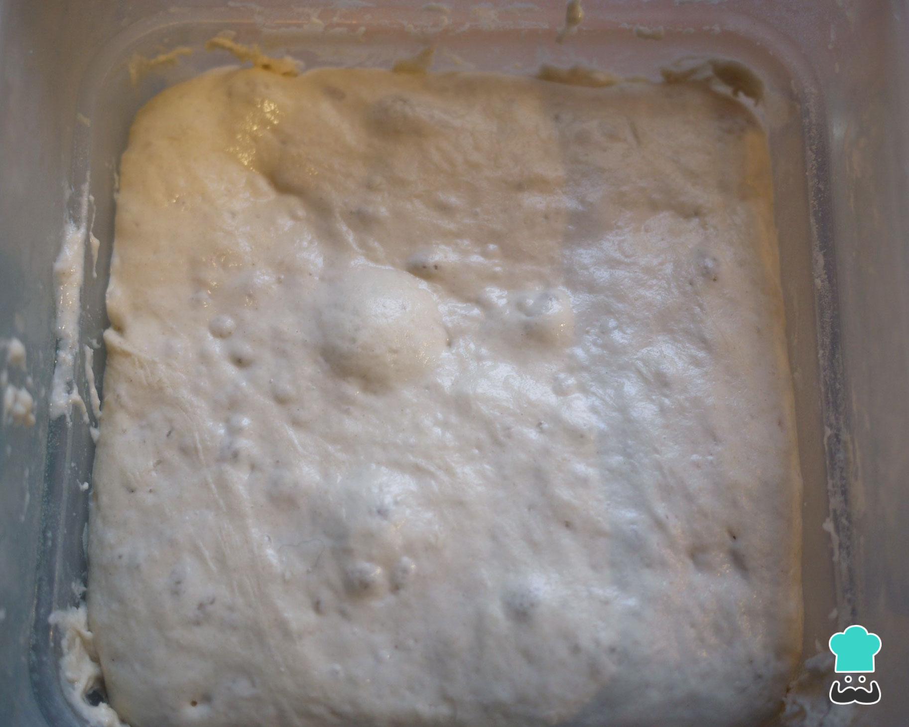Após esse tempo, incorpore os restantes ingredientes (500 ml água e 1 quilo de farinha) e amasse novamente por uns minutos, até obter uma massa mais consistente.