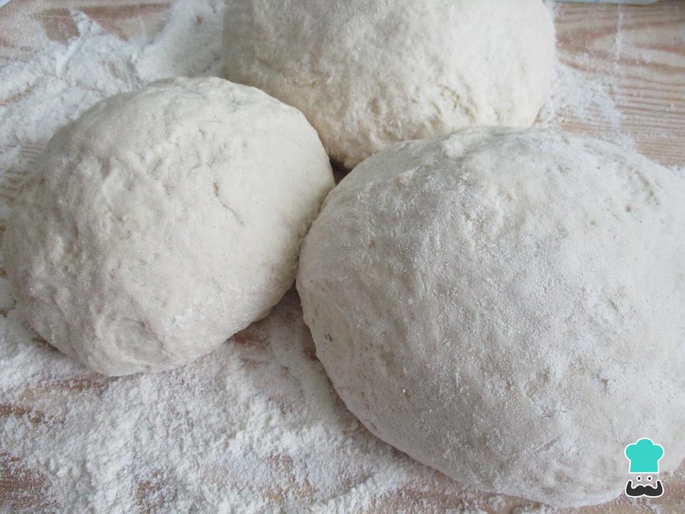 Coloque a farinha peneirada em uma tigela grande e acrescente o fermento dissolvido. Adicione a água restante e misture com as mãos. O resultado deverá ser uma massa bem grudenta mas sem grumos.