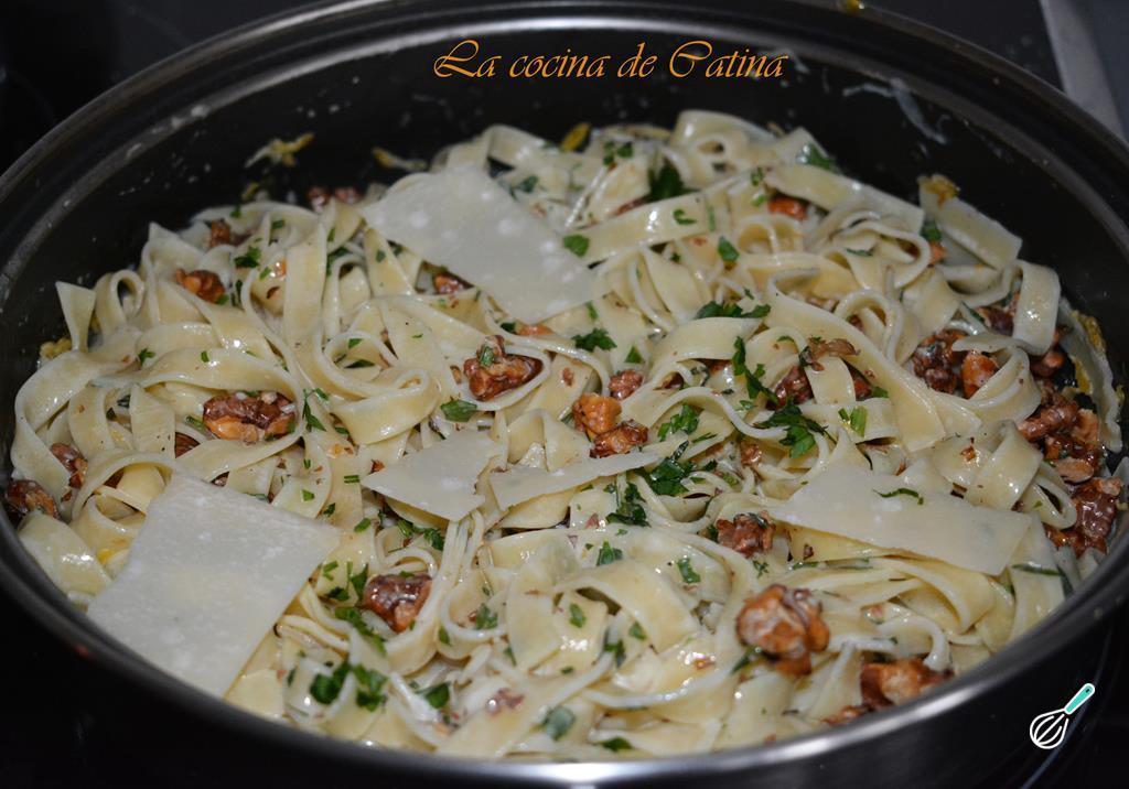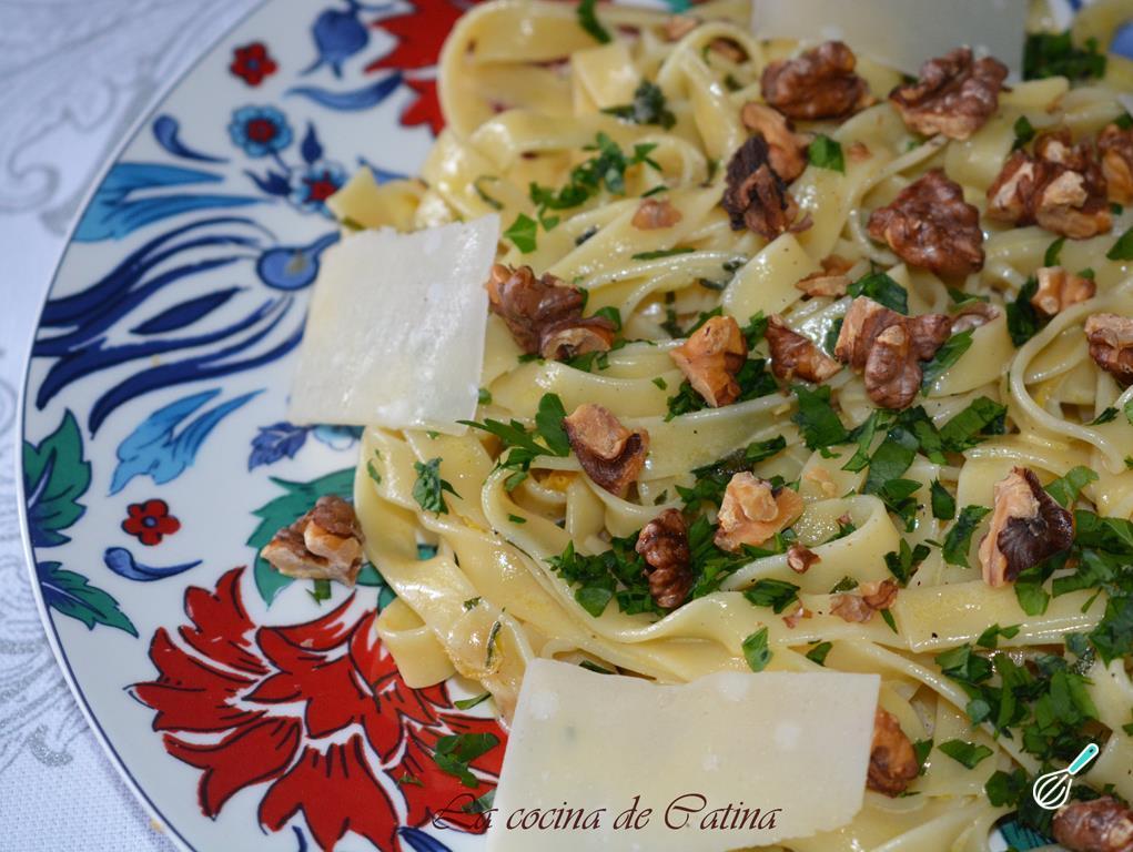 Escorra o macarrão reservando 2 colheres de sopa da água da cozedura. Coloque o macarrão em um prato de servir e adicione o molho preparado no passo 1, a água do cozimento e o suco de limão. Misture tudo e decore com as nozes, o parmesão e salsinha.