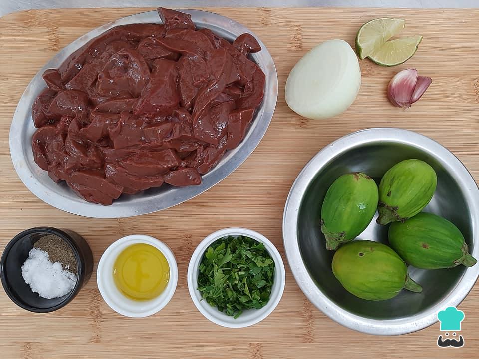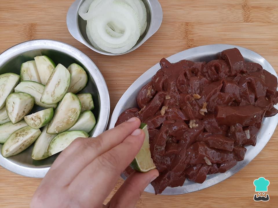 Tempere as iscas de fígado com sal, pimenta do reino, alho e gotinhas de limão. Corte os jilós em 4 pedaços ou em rodelas, se preferir, e corte a cebola em rodelas.