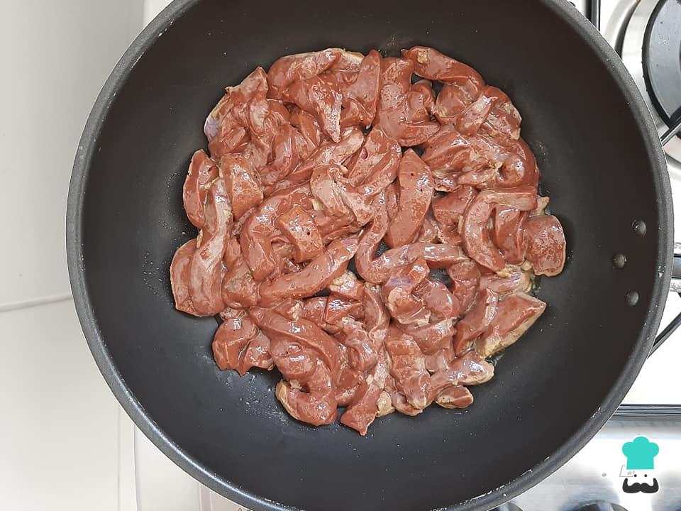 Em uma frigideira média aquecida, adicione o azeite de oliva e refogue as iscas de fígado temperadas, até que comecem a mudar de cor.