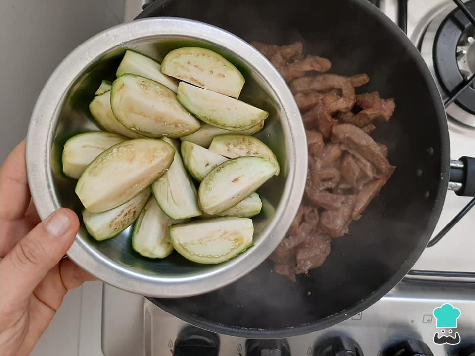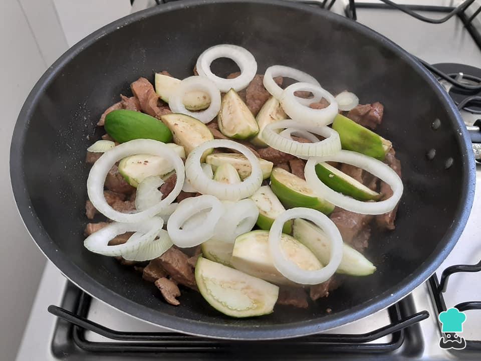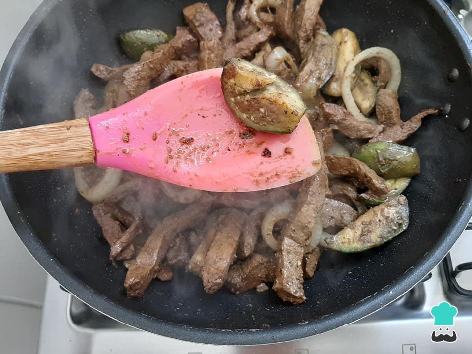 Quando as iscas de fígado bovino mudarem de cor, adicione os pedaços de jiló e as rodelas de cebola.
