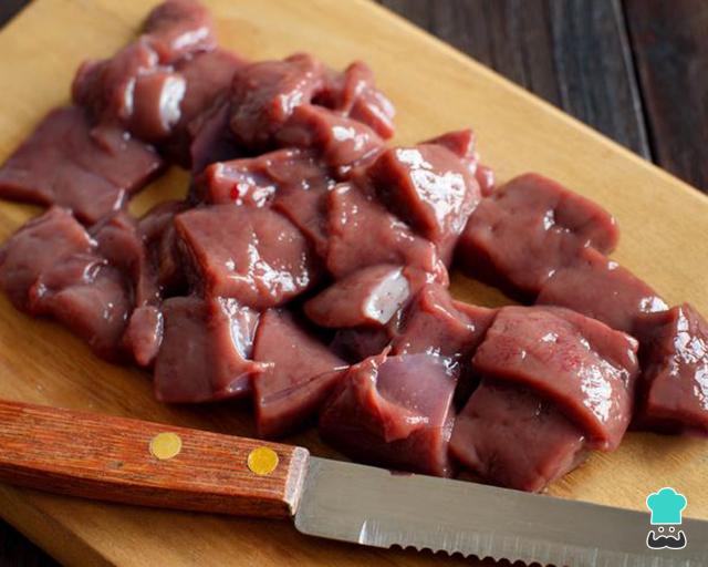 Prepare o fígado bovino cortando-o em pedaços de tamanho igual, como na fotografia, e temperando com sal e pimenta a gosto. Pique também a cebola em pedaços de tamanho médio ou em rodelas.