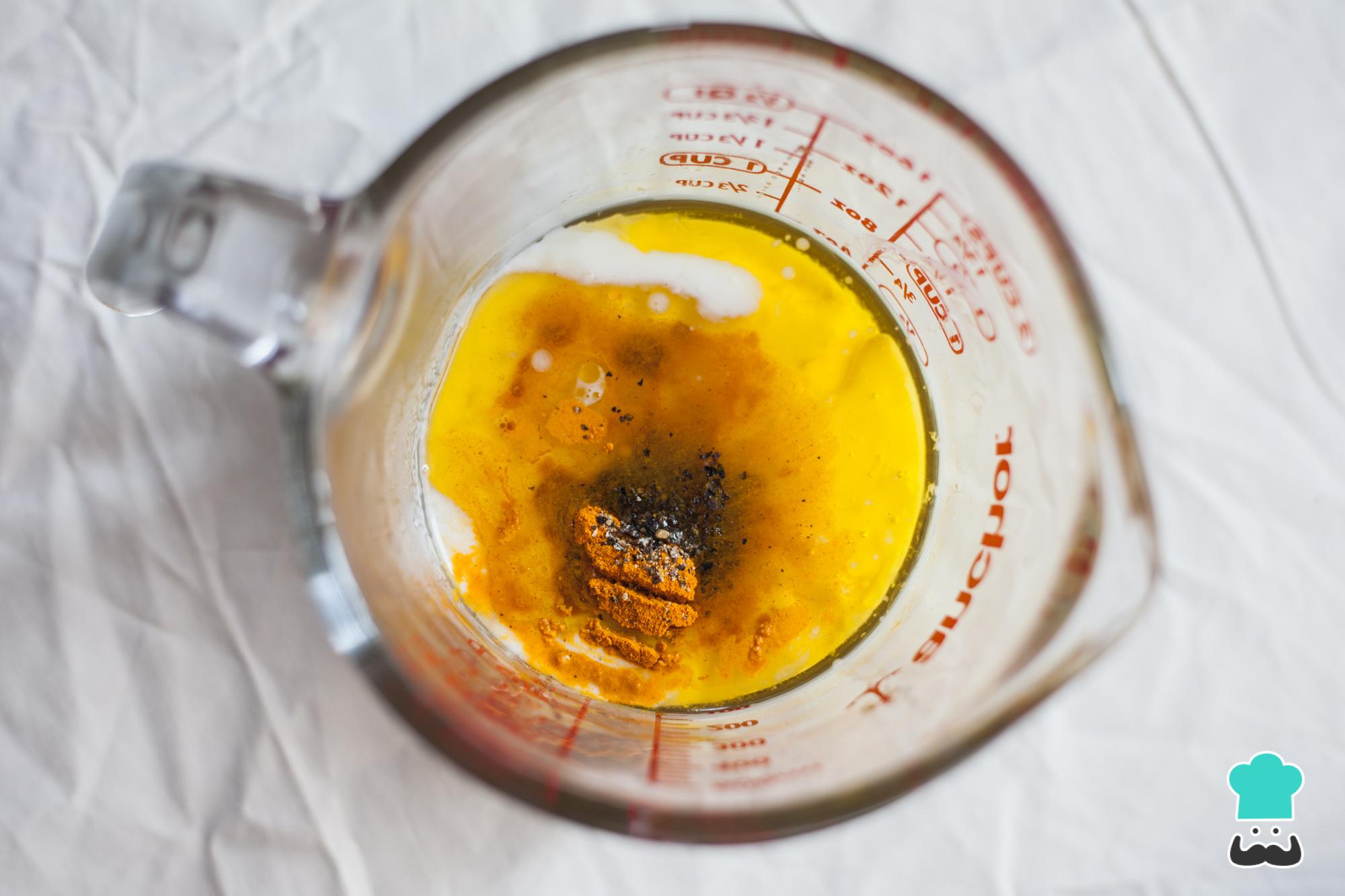 Prepare o tempero de cúrcuma dos peitos de frango misturando o óleo com a cúrcuma, o sal e a pimenta do reino a gosto.