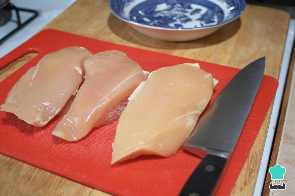Limpe os peitos de frango de pele, gordura e osso e corte cada peito de frango em 2 filés. Esfregue neles o tempero anterior, coloque numa assadeira e reserve por 30 minutos a 2 horas, para que a carne absorva os sabores.