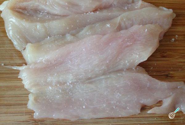 Comece esta receita de filé de frango empanado, batendo os filés com um martelo de carne para amaciar e ficarem finos.