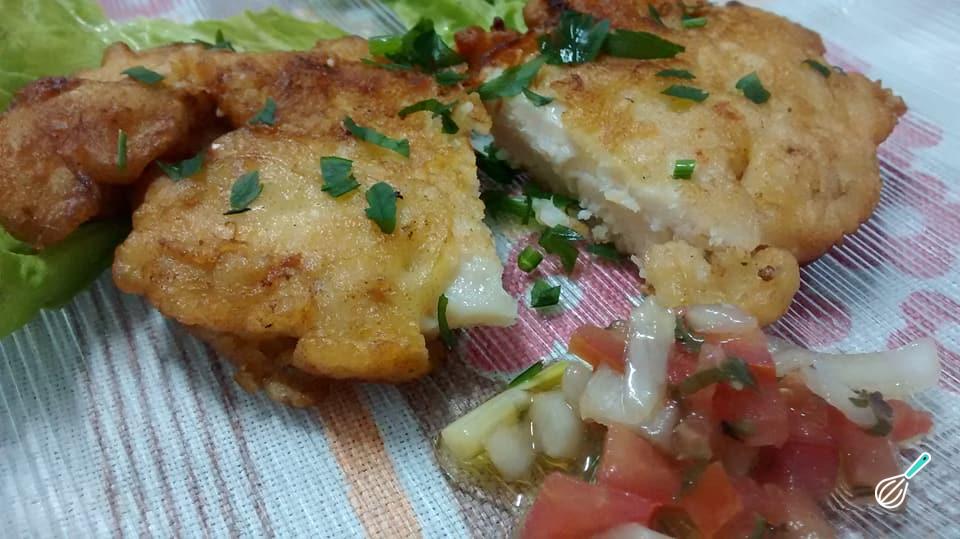 Passe os filé de frango pela massa e leve a fritar em uma frigideira com óleo quente, até ficarem dourados.