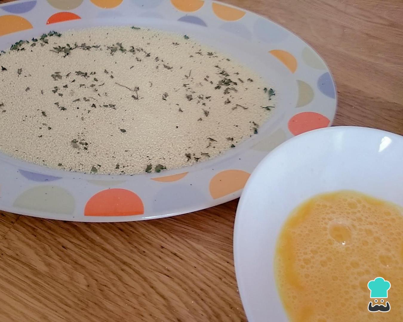 Num prato coloque a farinha de rosca e, se quiser, misture nela o tempero de alho em pó e salsinha desidratada. Noutro prato coloque o ovo e bata bem, até espumar. Estes são os ingredientes para empanar os filés de frango.