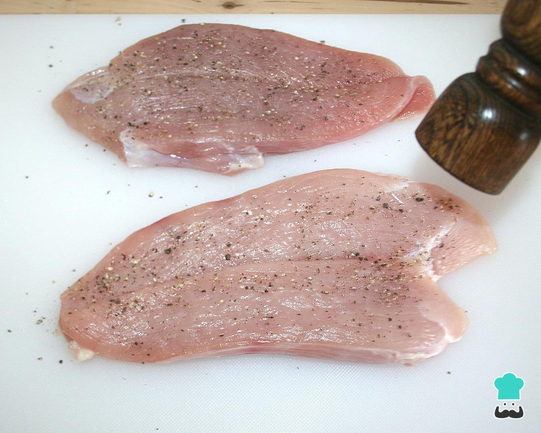 Corte os peitos de frango em duas metades ou 3 filés. Tempere de um lado e do outro com sal e pimenta ou confira nossas sugestões de como temperar filé de frango.