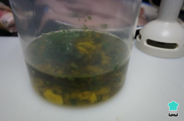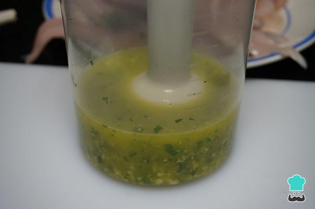 Para preparar o molho de alho e óleo bata no liquidificador ou com o mixer o azeite, o alho descascado e a salsinha.
