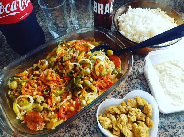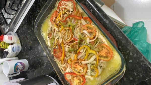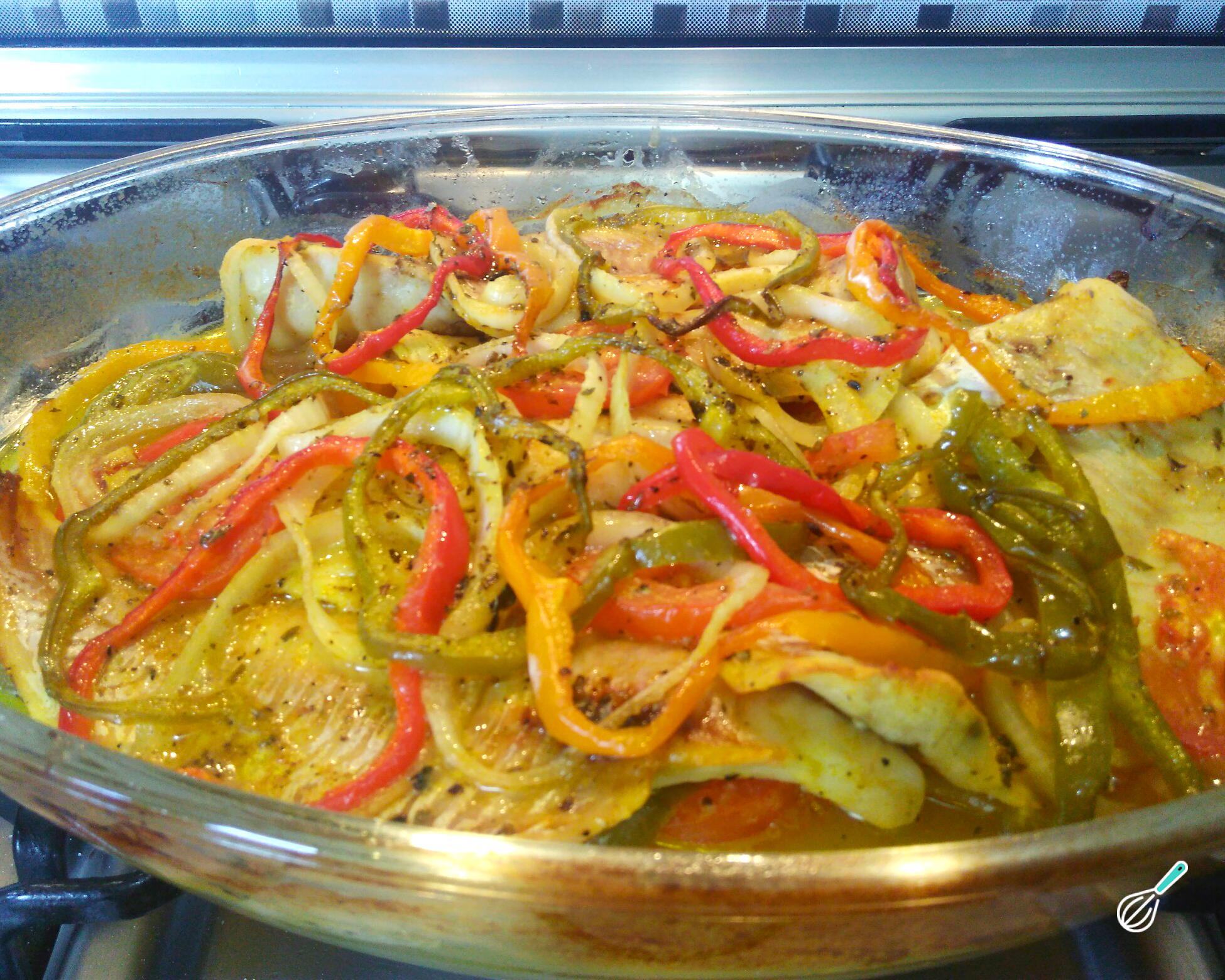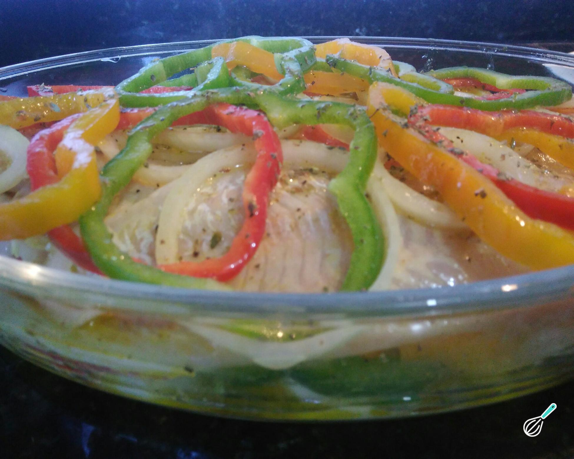 Coloque o peixe marinado no refratário e cubra com a cebola, tomate e pimentões que restaram. Jogue o caldo do marinado por cima e coloque um pouco mais de azeite.
