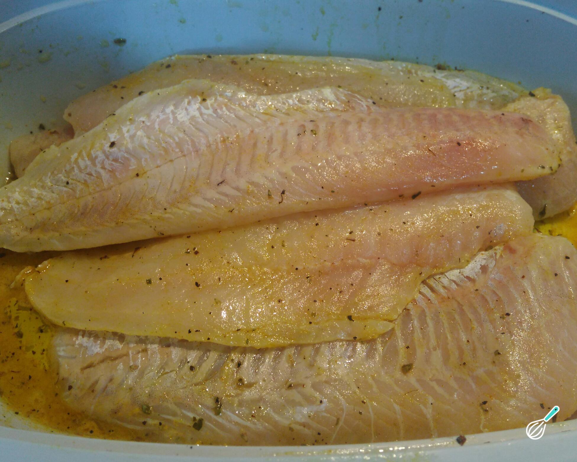 Em um refratário tempere o filé de peixe com sal, pimenta, açafrão, orégano, azeite e o suco do limão. Deixe marinando por, no mínimo, 1 hora - assim o peixe pega bem o sabor dos temperos.
