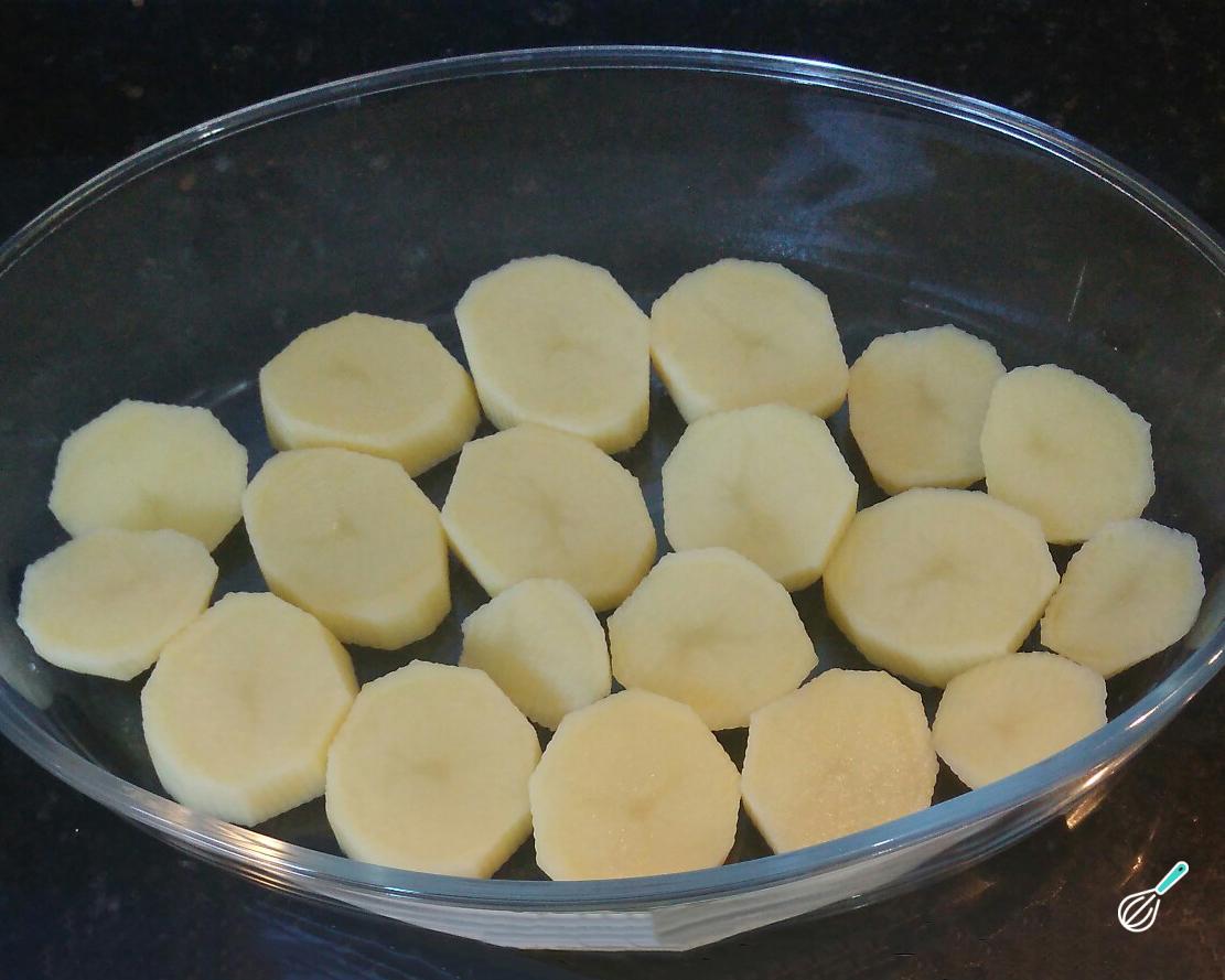 Depois do tempo indicado corte as batatas em rodelas não muito finas e coloque num refratário untado.