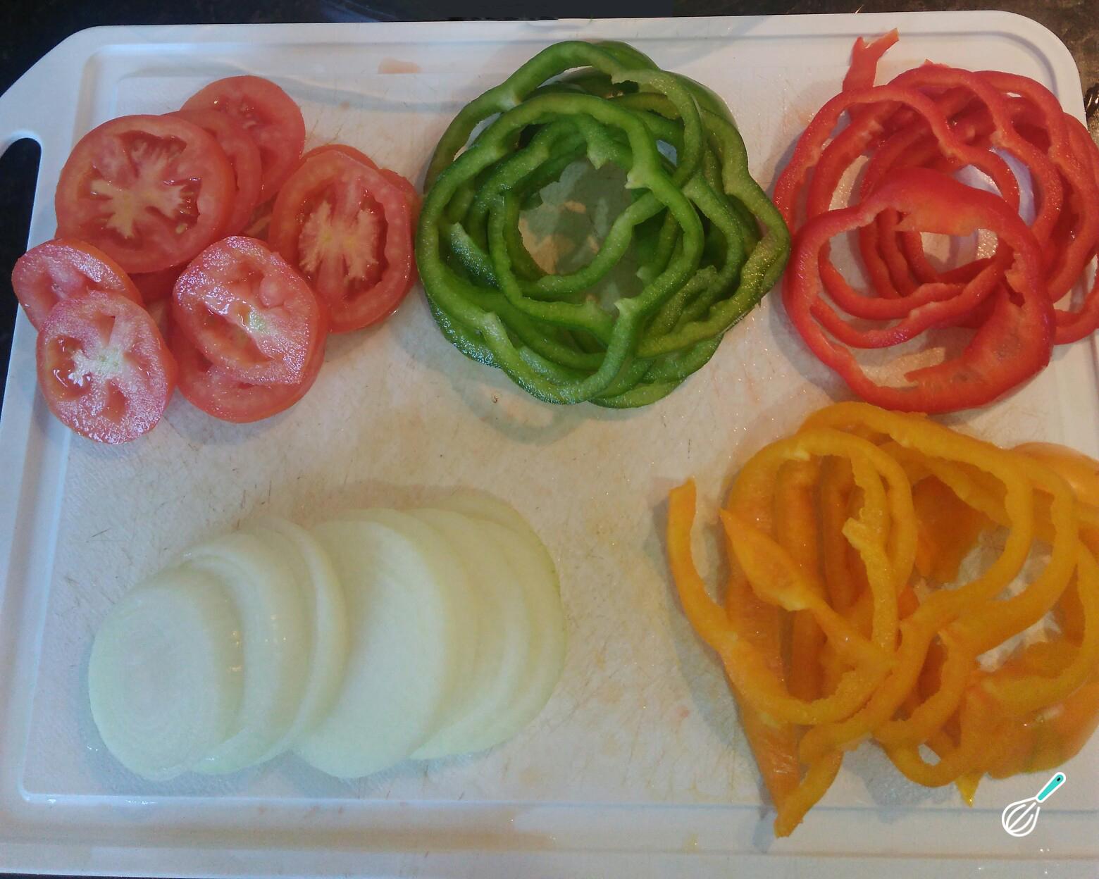 Corte também em rodelas os restantes legumes: os tomates, os pimentões e a cebola. Coloque metade destes legumes no refratário e salpique um pouquinho de sal, para que eles também peguem o gosto.