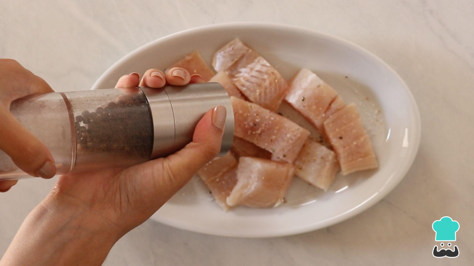 Se desejar, corte o filé de merluza em pedaços menores, no tamanho que desejar. Tempere com sal, pimenta e um fio de azeite.