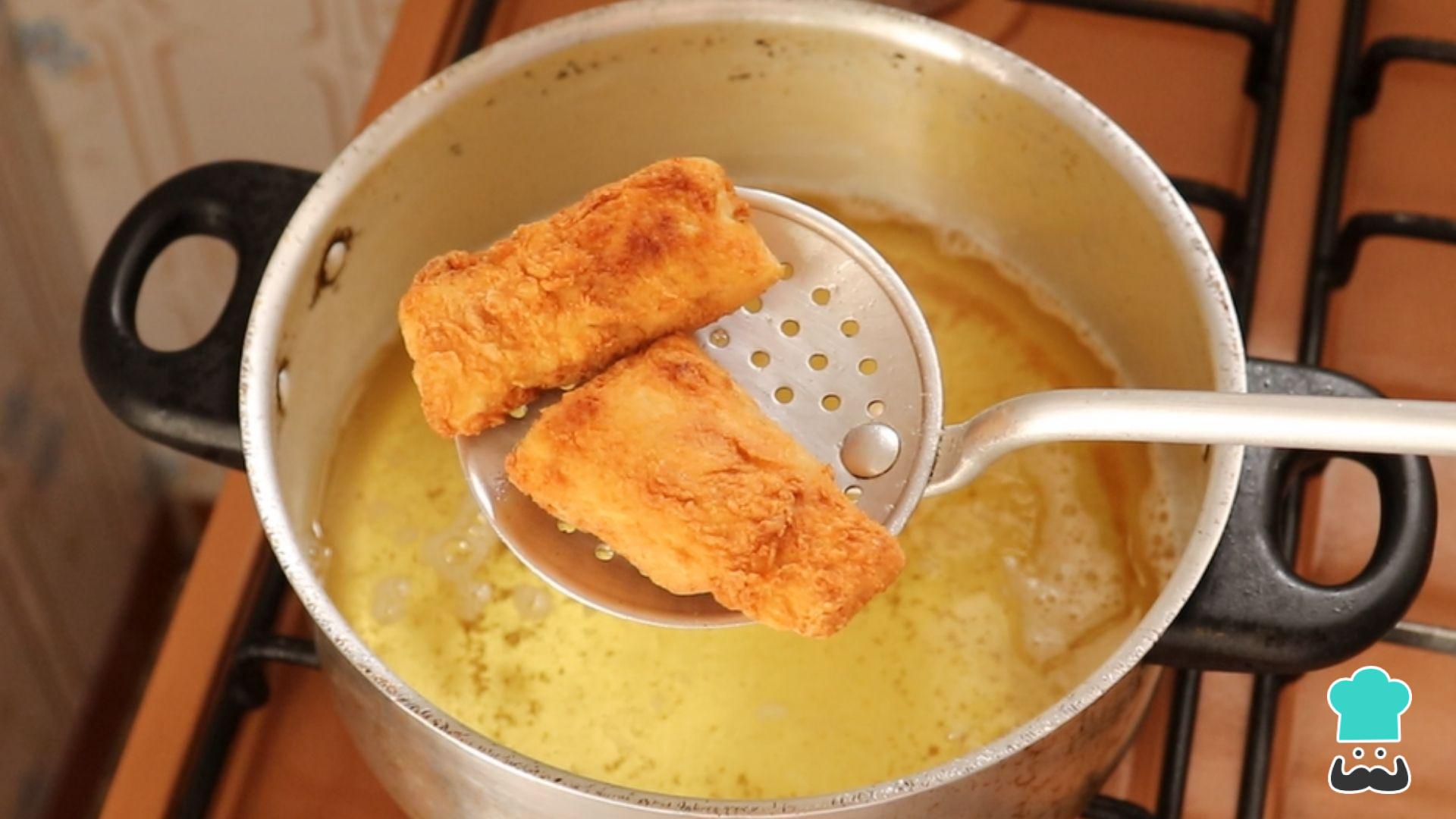 Frite em óleo novo, limpo e na quantidade suficiente para cobrir todos os pedaços. Frite até ficarem bem dourados.