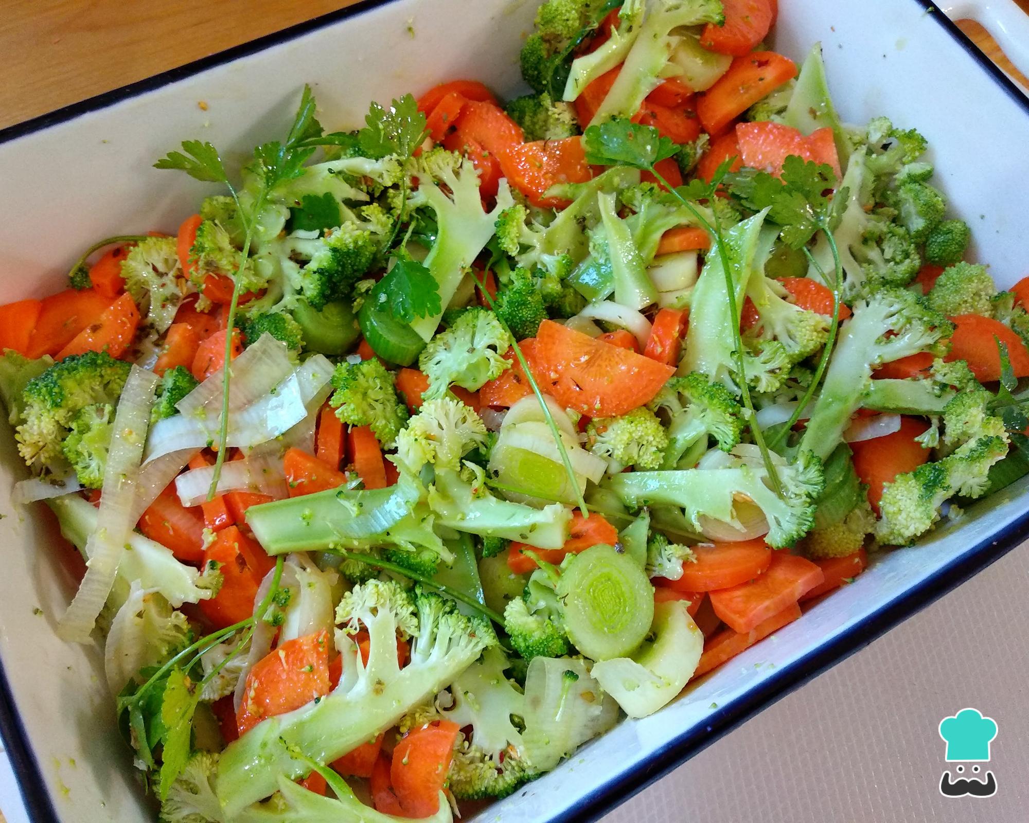 Pique os legumes finamente, para que cozinhem mais depressa, e coloque numa assadeira. Coloque também os ramos de salsa inteiros e tempere com 1 colher de sopa de chimichurri, sal a gosto e um fio de azeite. Misture tudo e leve ao forno a 180ºC por 10 minutos.