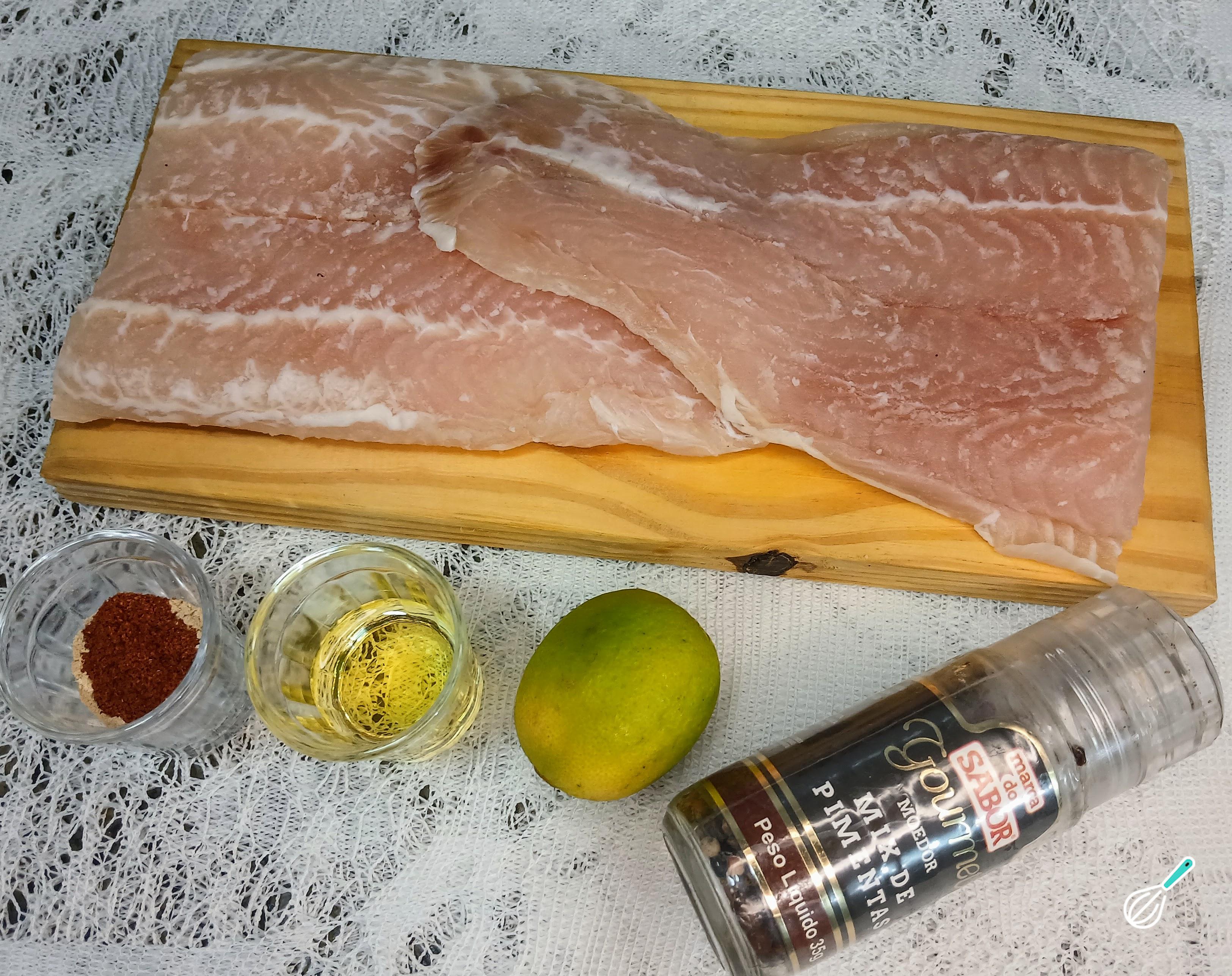 Comece separando os ingredientes para o preparo do filé de peixe. Separe os filés, os temperos de sua preferência, o limão e o sal. Separe o óleo que será usado para selar os filés de peixe.