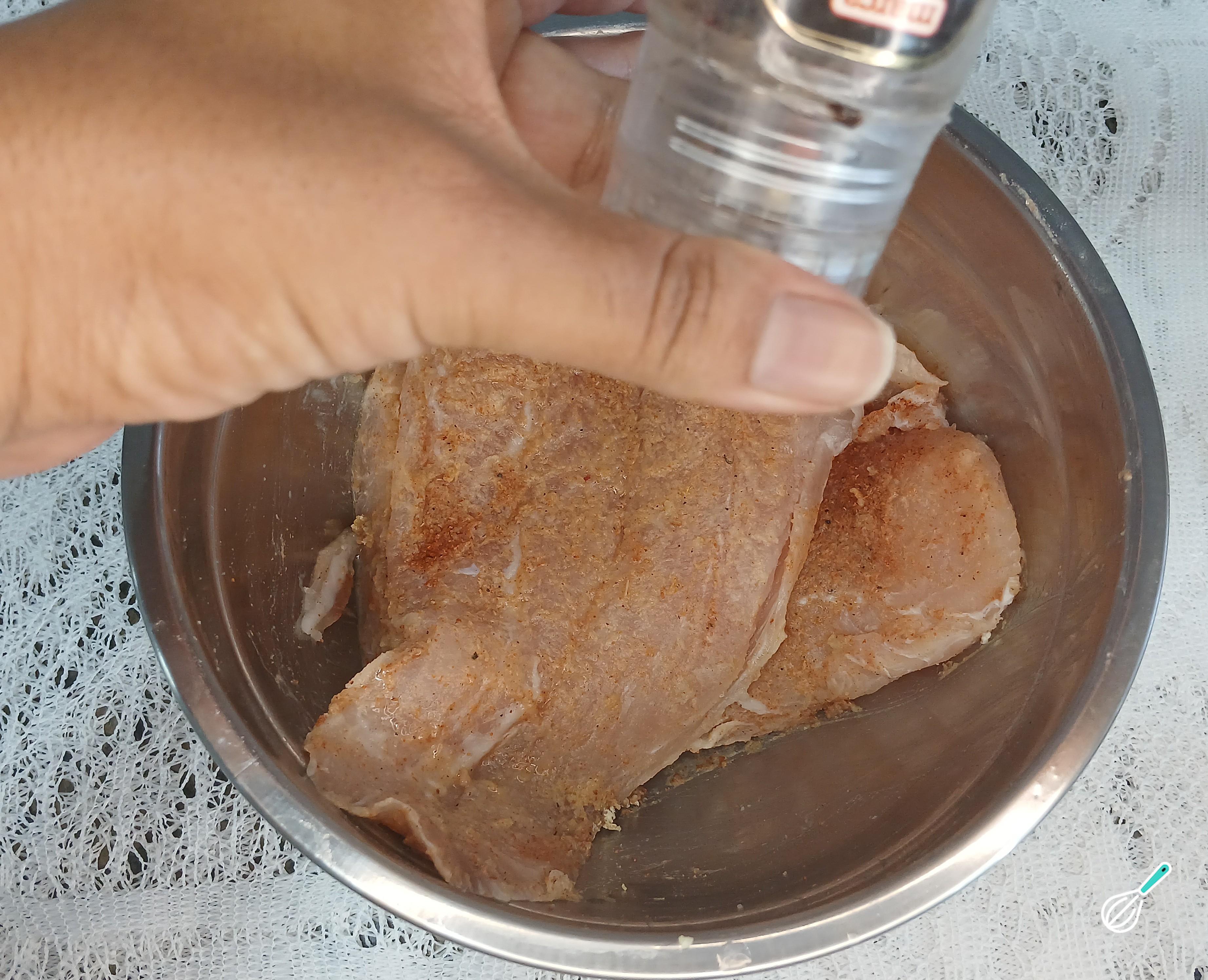 Feito isso em um bowl, coloque o peixe e acrescente os temperos. Corte o limão e esprema o suco. Acrescente sal e pimenta. Com as mãos esfregue bem os temperos no filé de peixe.