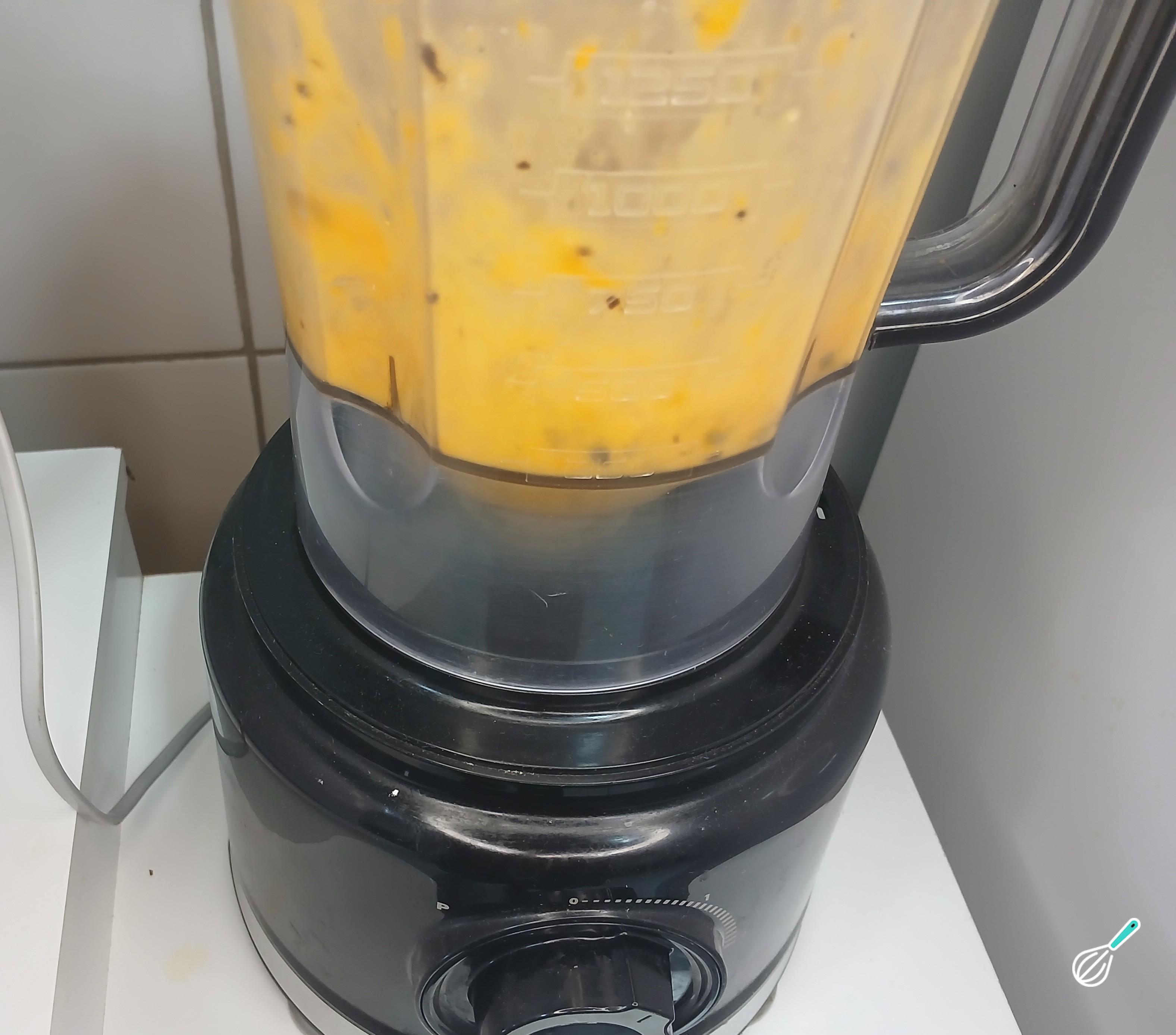Separe uma colher de chá da polpa do maracujá. Em seguida leve todos os ingredientes ao liquidificador. Bata até ficar bem homogêneo.