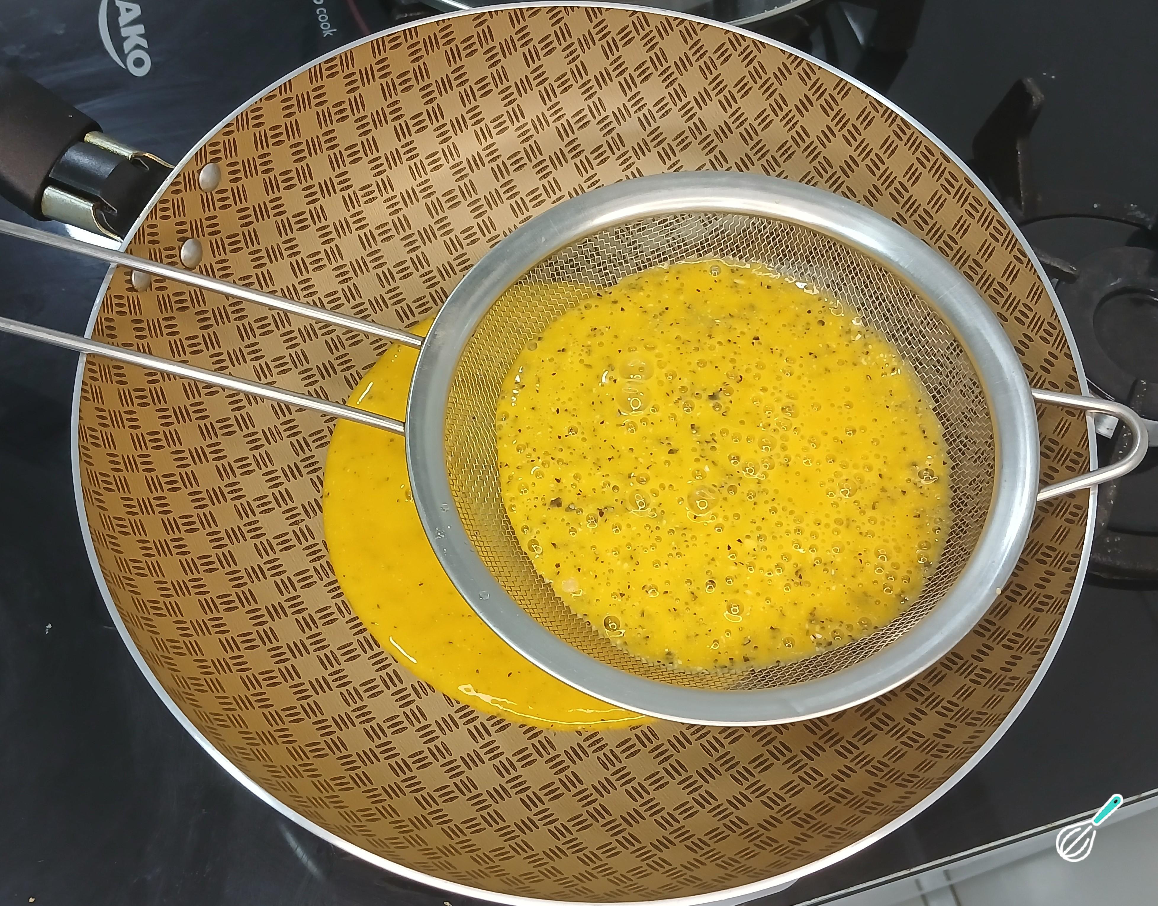 Feito isso, transfira o conteúdo do liquidificador para uma peneira fina e coe. Coloque a polpa em uma panela para o preparo do molho.