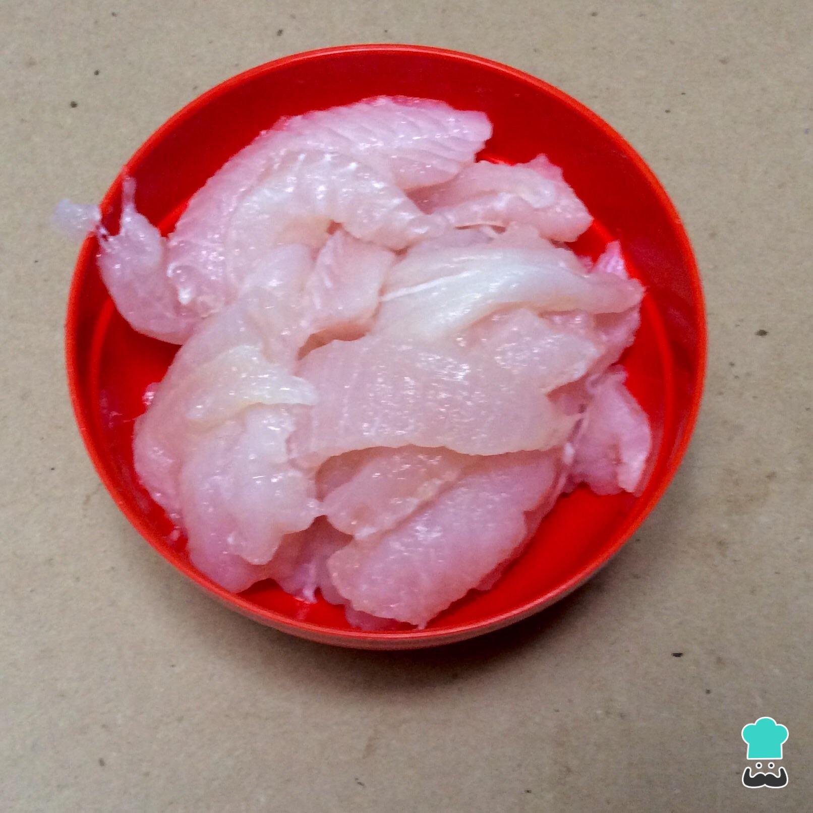 Corte o peixe em tiras com aproximadamente 5 cm, para que cozinhe rapidamente, e tempere com sal e pimenta a gosto.