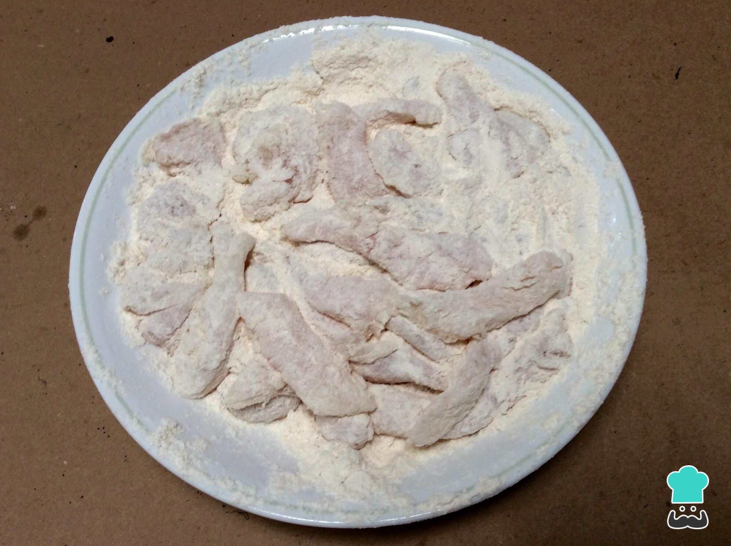 Depois envolva bem as tiras de peixe na farinha, até que fiquem sequinhas.