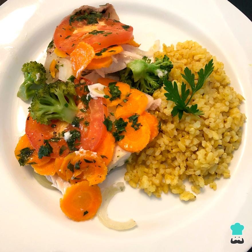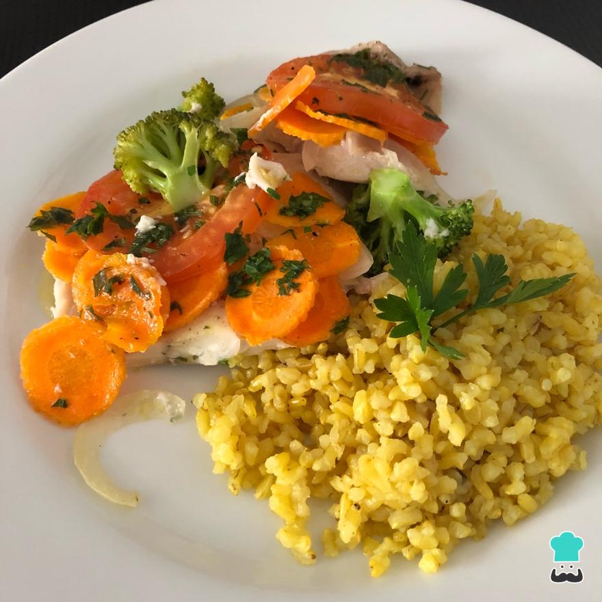 Sirva seu filé de peixe no papelote com legumes acompanhado com arroz integral ou com uma guarnição de sua preferência. Bom apetite e, quando preparar, suba foto do seu peixe no papelote!