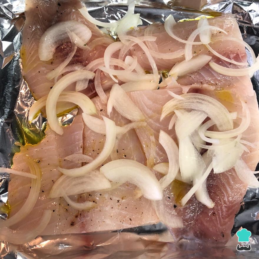 Em uma forma, forrada com papel alumínio ou manteiga, coloque uma colher de sopa de azeite e e disponha os filés por cima. Comece então colocando a cebola fatiada para preparar esta receita de filé de peixe no papelote com legumes.