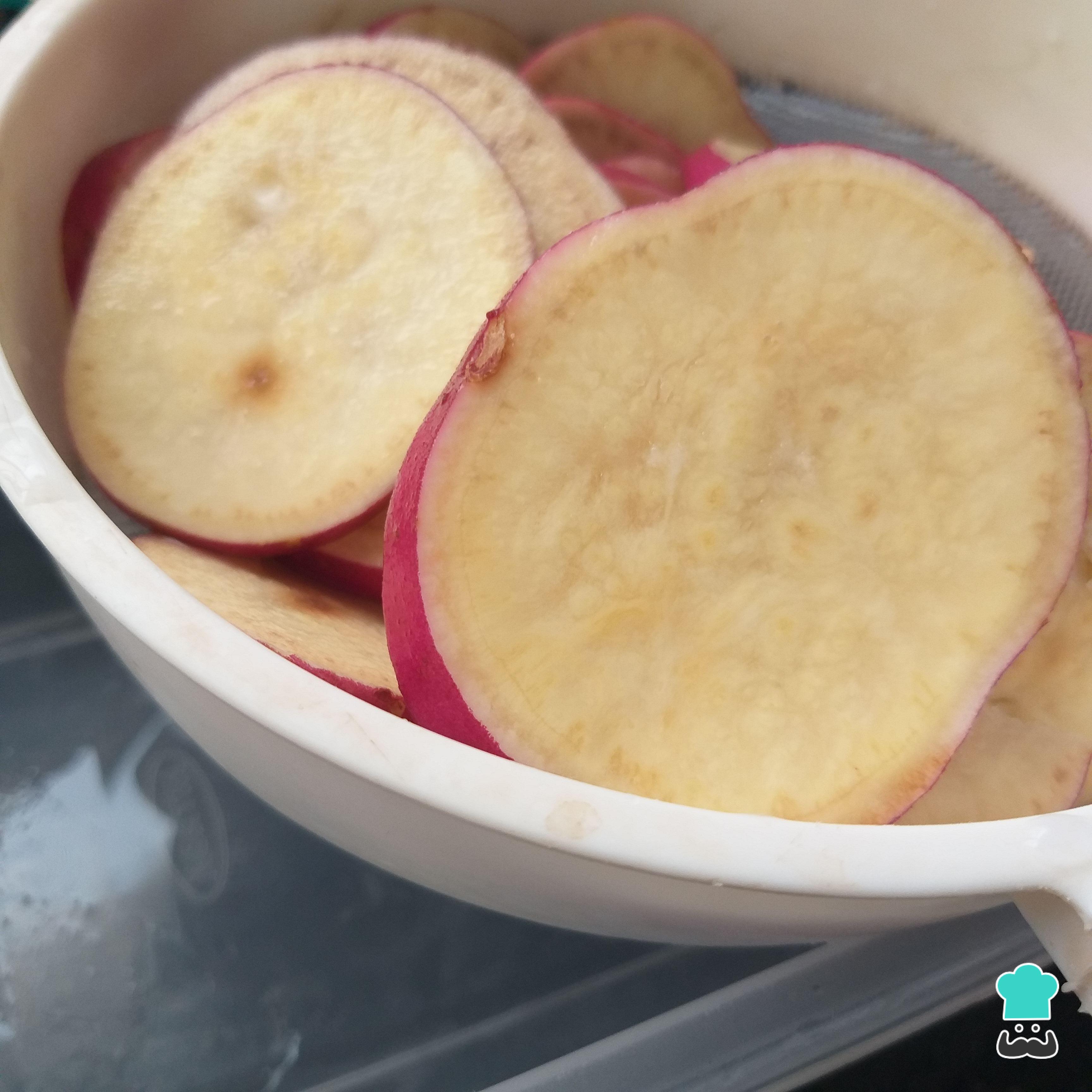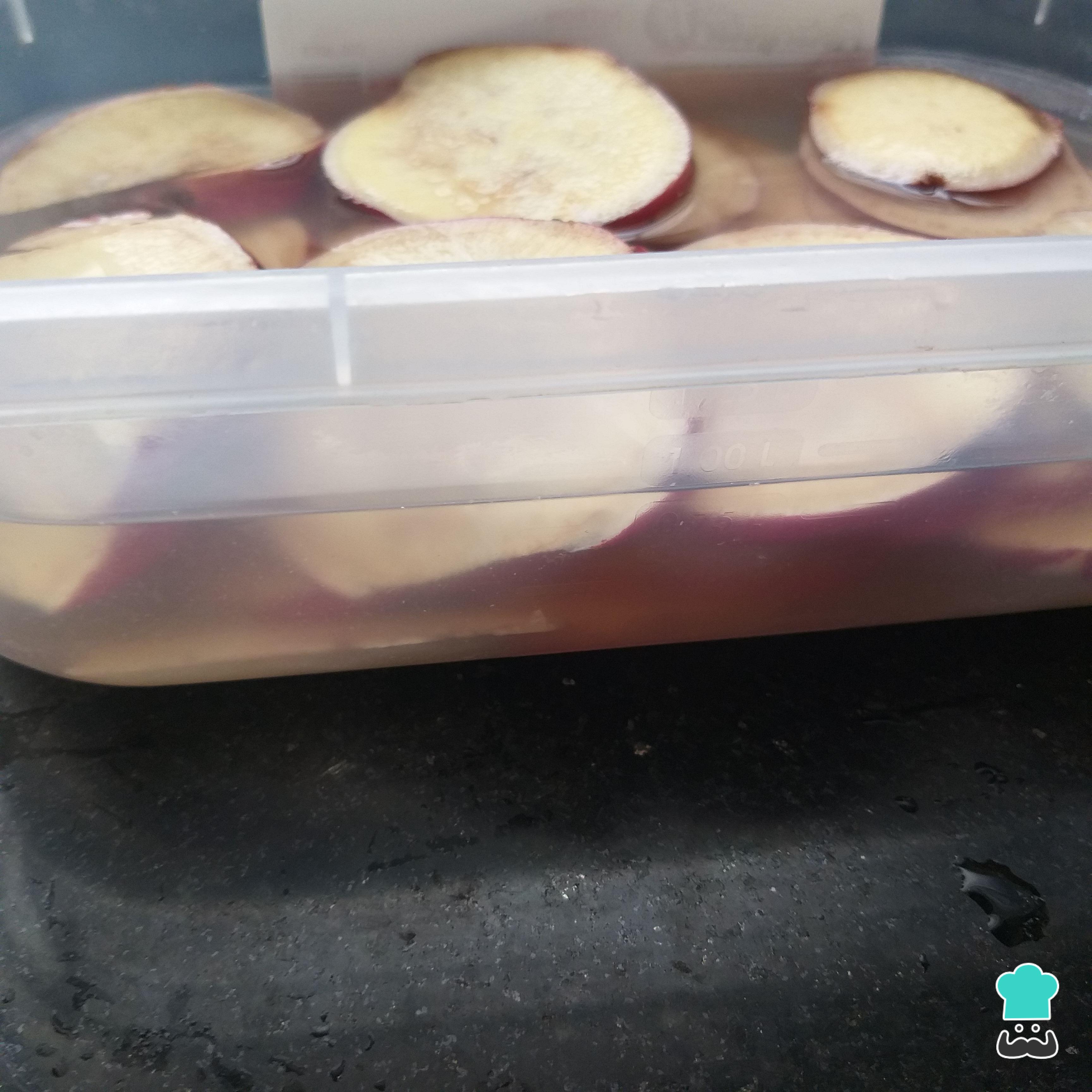 Corte as batatas em rodelas e deixe de molho na água com vinagre por 15 minutos.