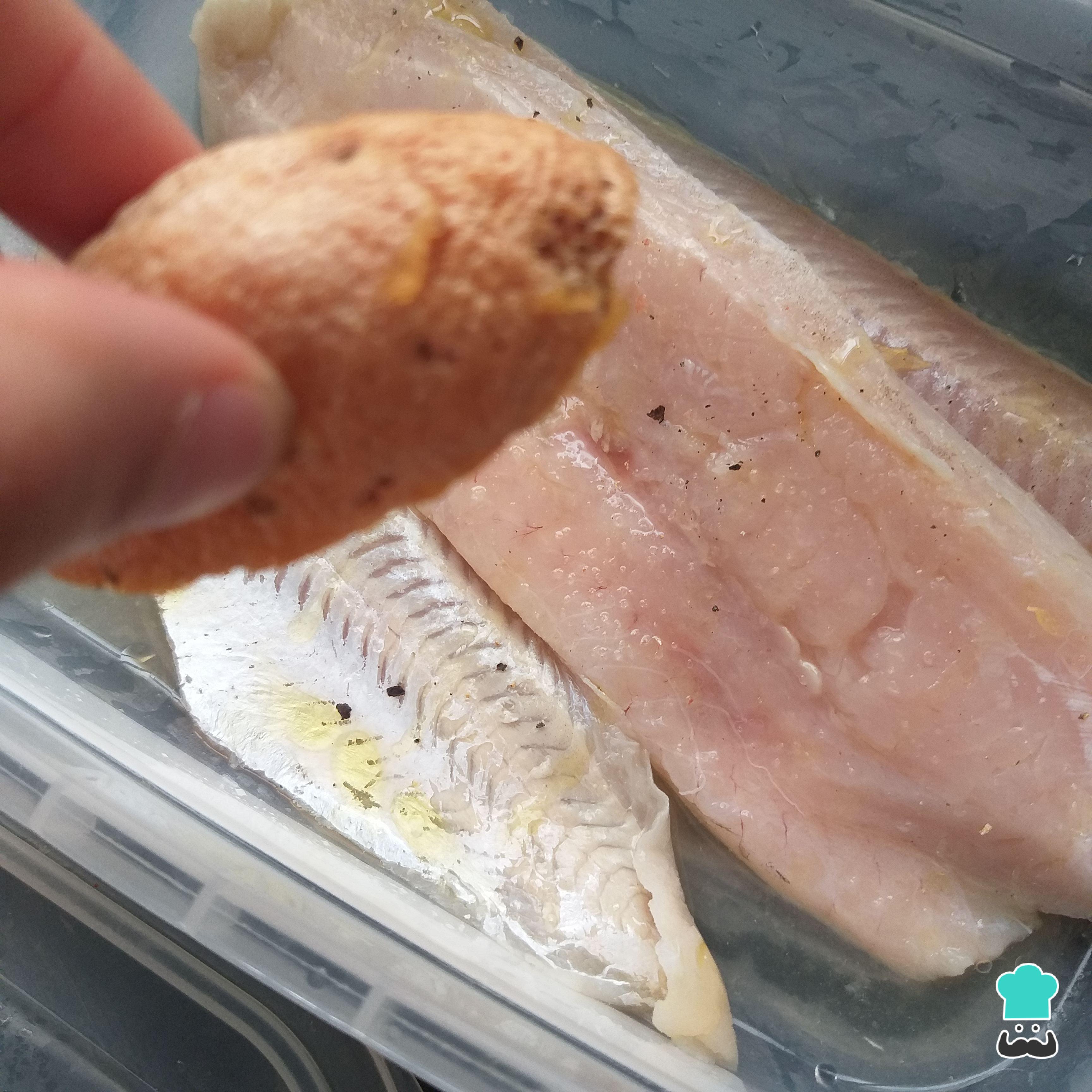 Em uma vasilha, coloque o peixe e misture o suco do limão, o sal, o alho. Deixe descansar por 15 minutos.