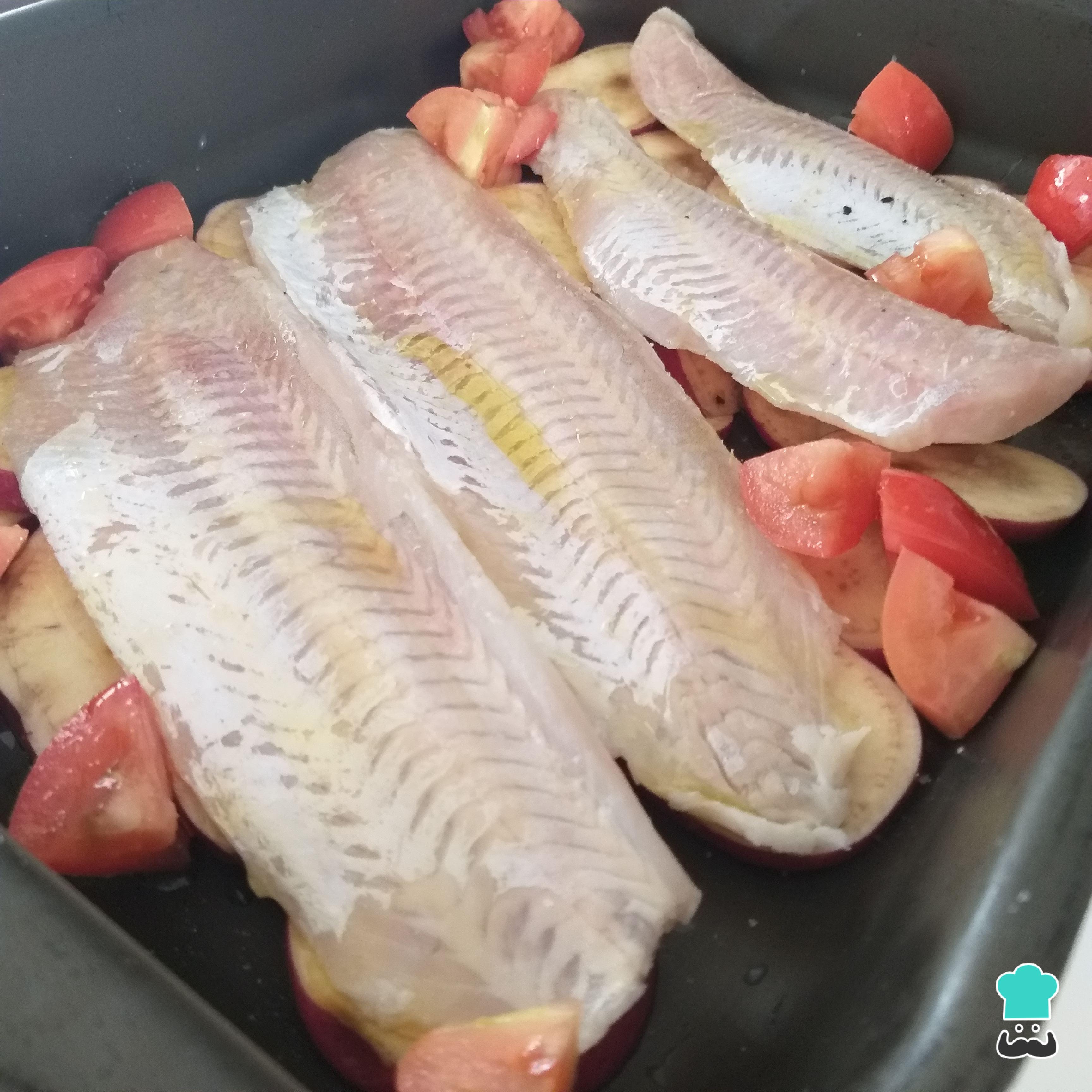 Transfira os filés de peixe com o tempero para uma assadeira. Acrescente as batatas e o tomate e regue tudo com azeite.