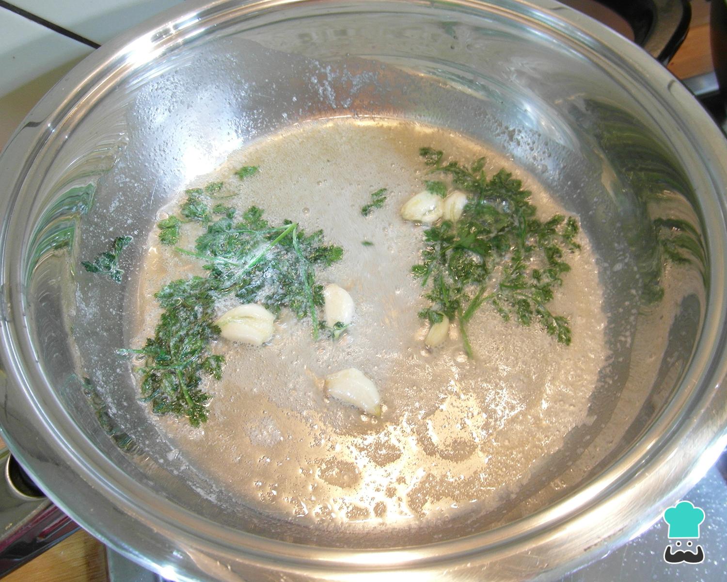 Leve ao fogo uma frigideira grande e coloque nela a manteiga, os alhos esmagados e a salsinha. Deixe a manteiga derreter e os alhos fritarem ligeiramente.