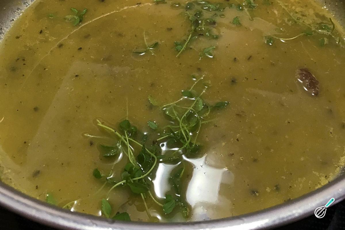 Na panela onde selou o filé mignon suíno, coloque o suco de laranja, o tomilho e os temperos (gengibre em pó, cebola em pó, alho em pó). Mexa até soltar todo o queimadinho do fundo.