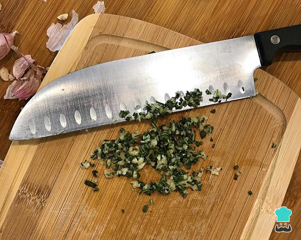 Comece seu filé mignon suíno com alecrim picando os temperos. Numa tábua junte o alho, o alecrim, o sal e a pimenta. Com a ajuda de uma faca pique tudo bem picadinho mesmo, como na foto.