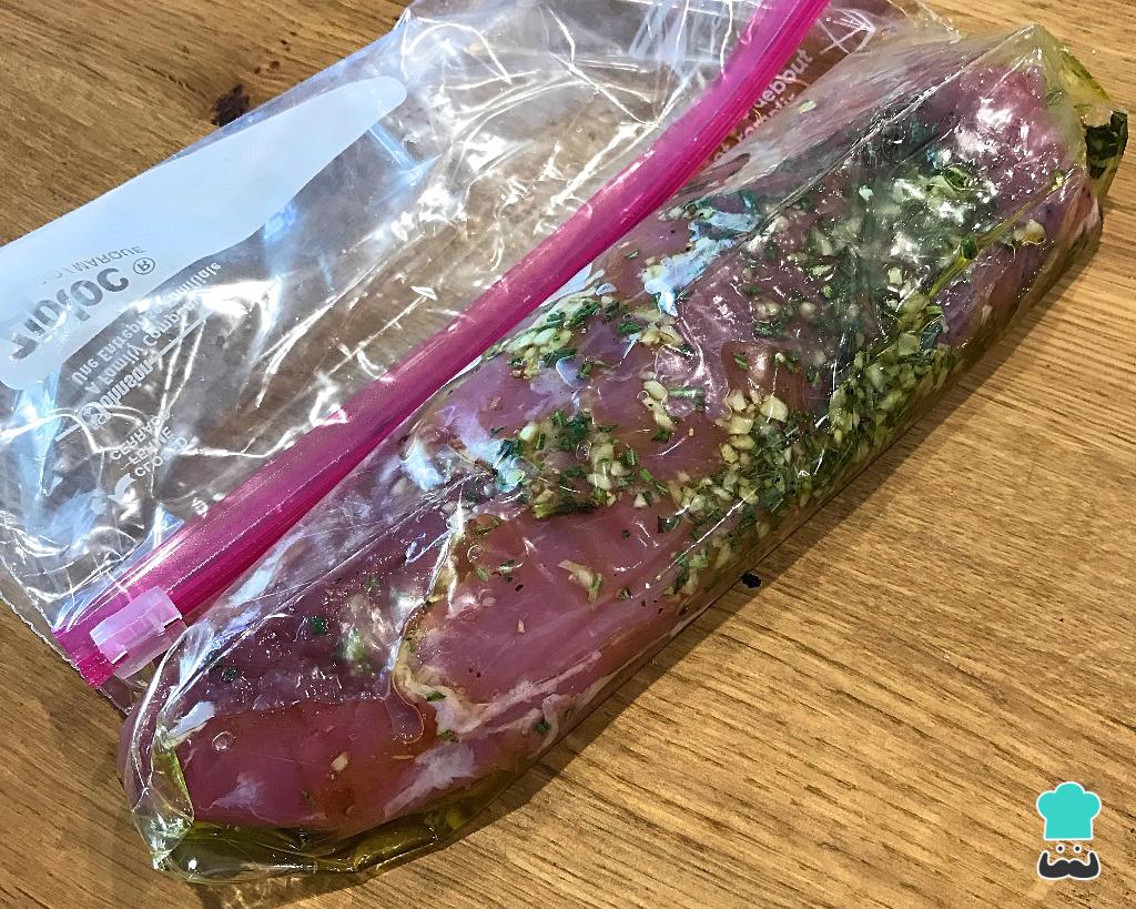 Use um refratário ou um saco selável e junte todos os ingredientes dentro dele. Tome o cuidado da marinada pegar bem em todos os lados do filé mignon e leve para geladeira por uma hora, no mínimo.