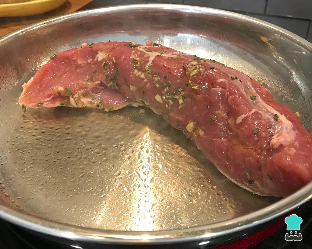 Aqueça bem uma frigideira e sele todos os lados do filé mignon suíno - não se preocupe que ele vai terminar de cozinhar no forno.