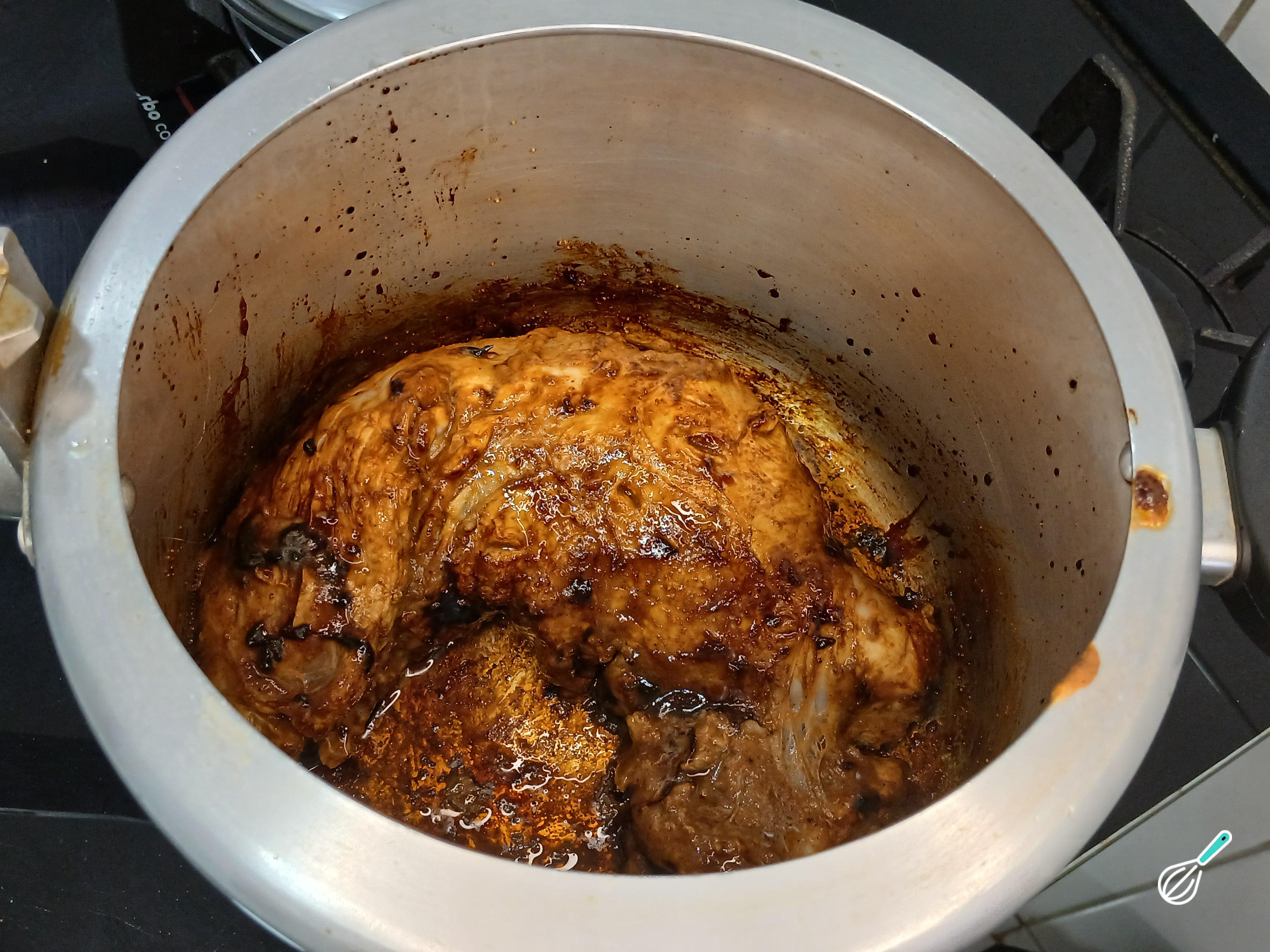 Depois disso, coloque na panela de pressão o óleo de soja e o açúcar para caramelizar. Em seguida, com um garfo longo coloque o filé mignon suíno já temperado. Deixe que doure dos dois lados e mantenha o fogo de médio para baixo virando sempre para não queimar.