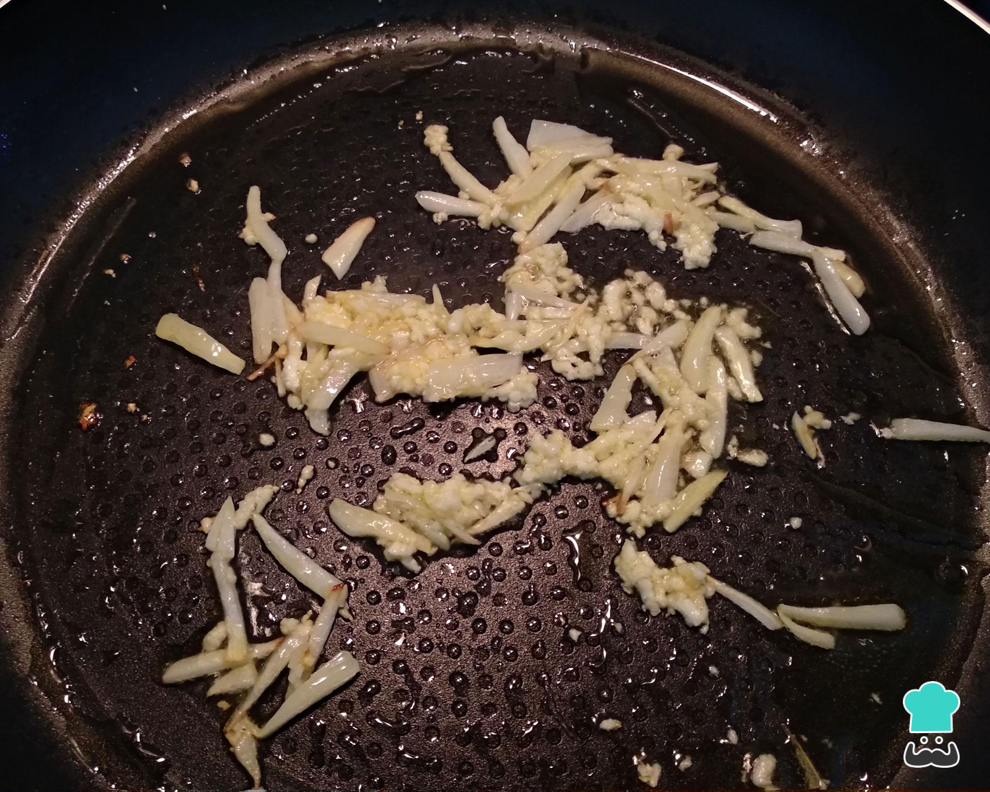 Primeiramente refogue a cebola e os alhos no azeite, de preferência numa frigideira antiaderente. Mexa de vez em quando para evitar queimar. Ligue o forno no modo Grill a 200ºC.