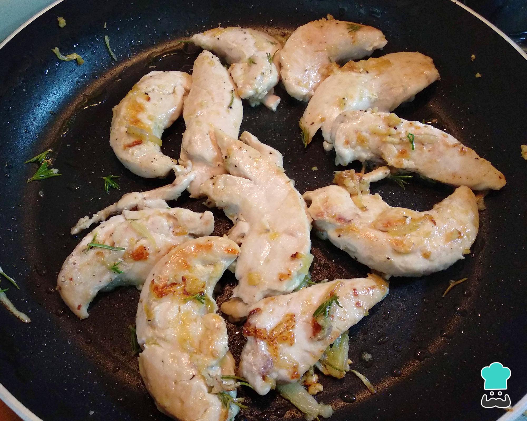 Adicione o sassami de frango e tempere com o alecrim, sal e pimenta. Deixe cozinhar no fogo médio por 5 minutos ou até o frango dourar dos dois lados, mexendo de vez em quando.
