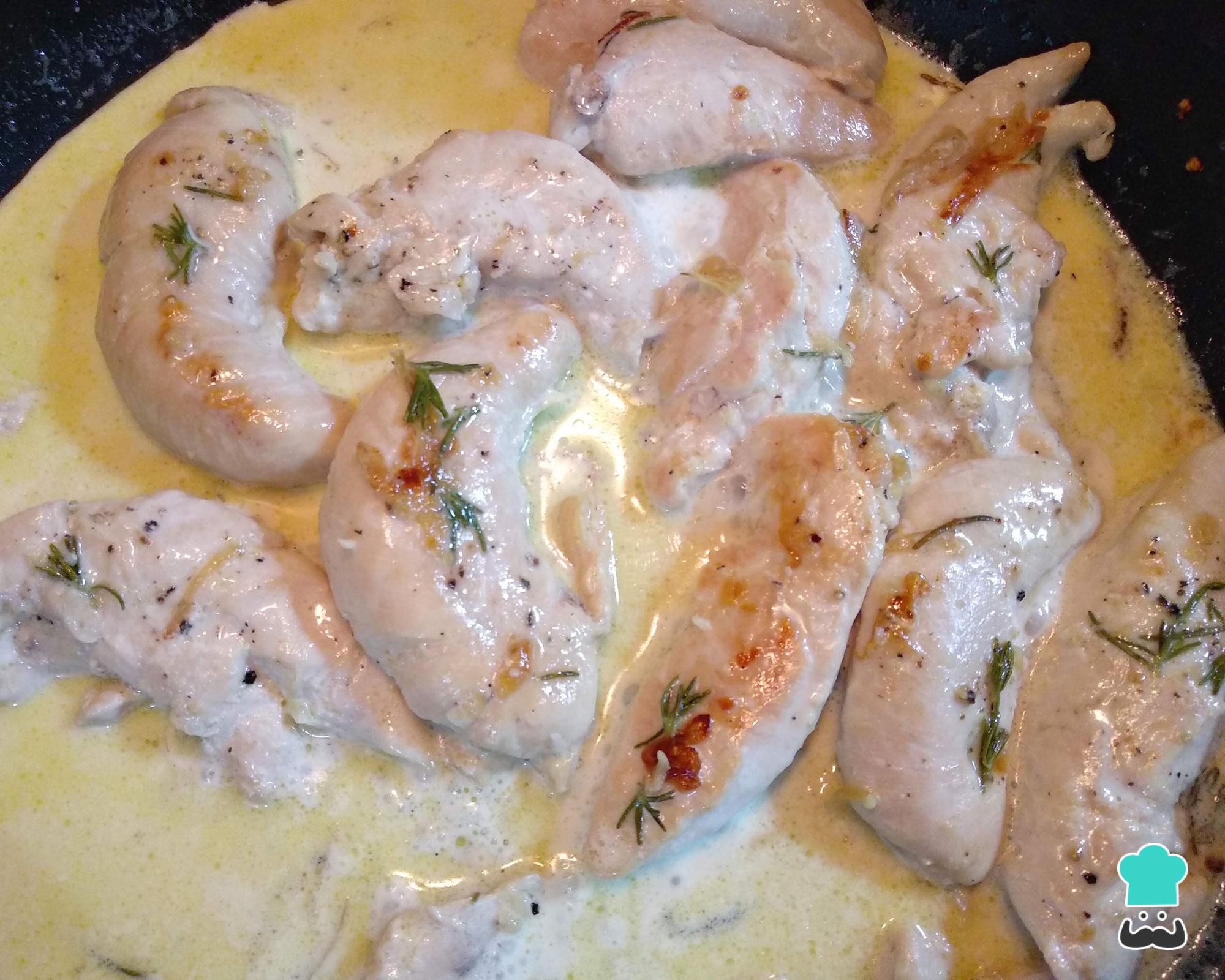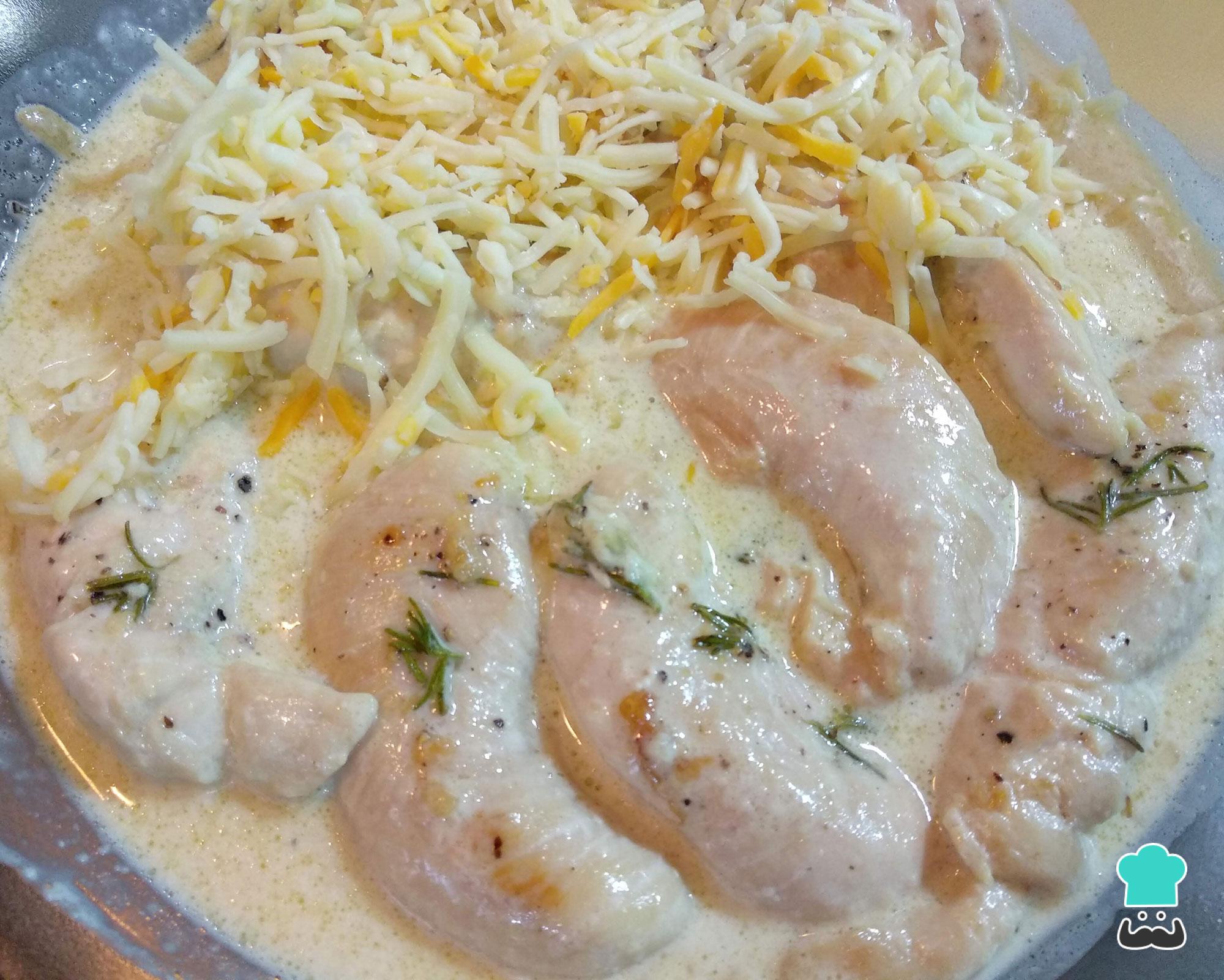 Seguidamente adicione o creme de leite e deixe cozinhar por mais 2-3 minutos ou até o filézinho de frango deixar de estar cru por dentro. Acerte o gosto com sal e pimenta.