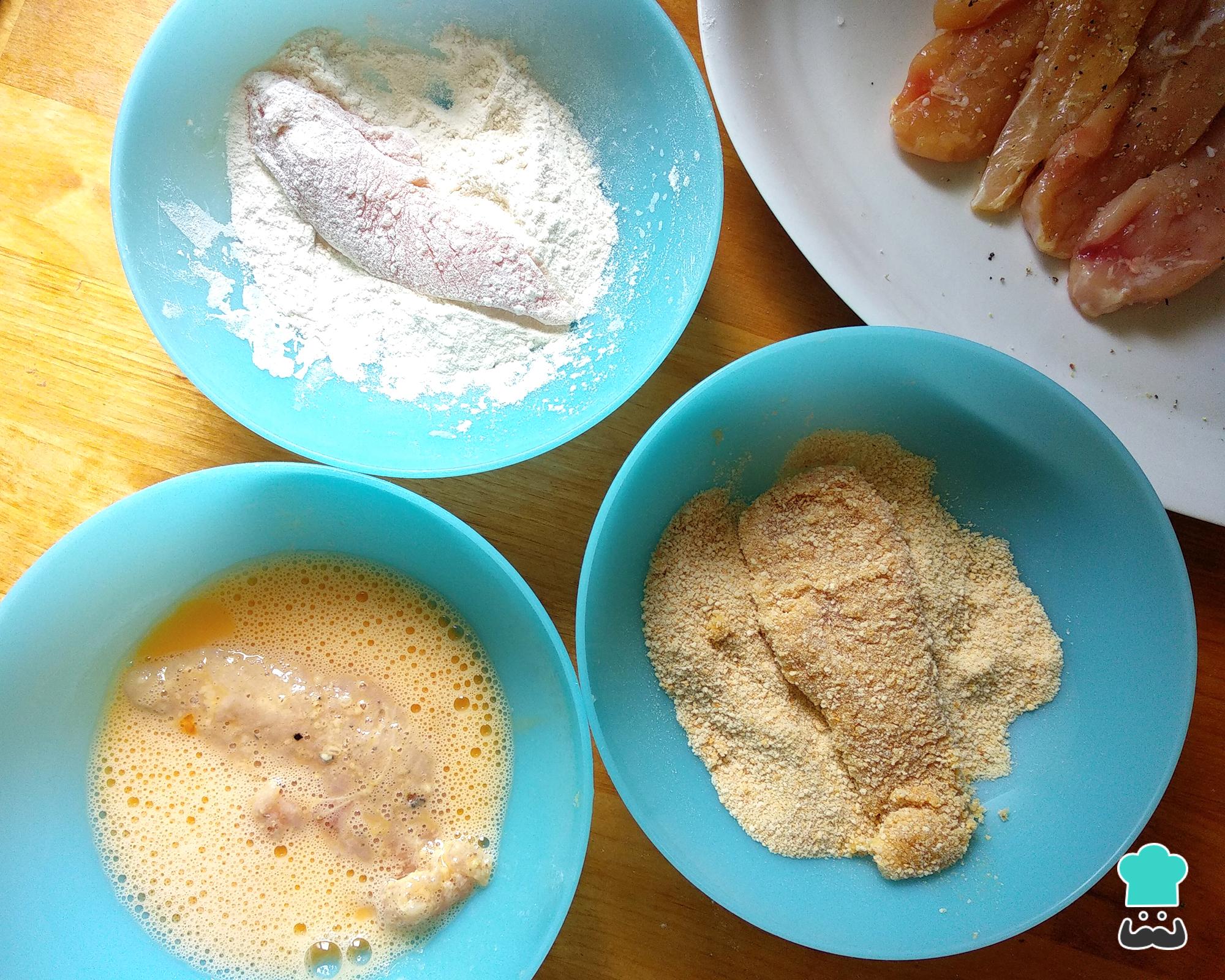 Numa tigela coloque o ovo batido, noutra coloque o trigo e, numa terceira tigela, coloque a farinha de rosca. Passe cada filé primeiro pela farinha, depois pelo ovo e, por último, pela farinha de rosca. Faça isso até empanar todos.