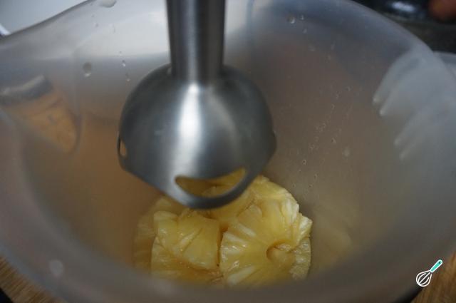 Ligue o forno a 200 ºC para que aqueça. Numa tigela coloque 6 rodelas de abacaxi bem escorridas, esmague-as até ficarem como um puré.