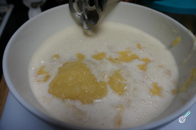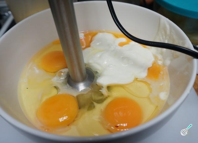 Coloque os ovos em uma tigela, bata-os e acrescente o leite condensado e o iogurte. Bata novamente até que os ingredientes estejam bem misturados .